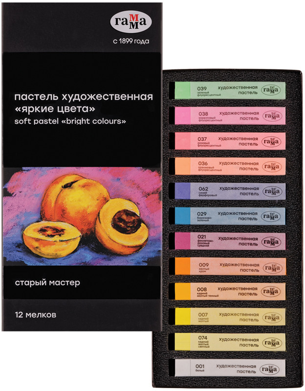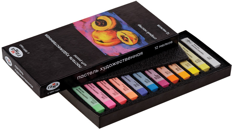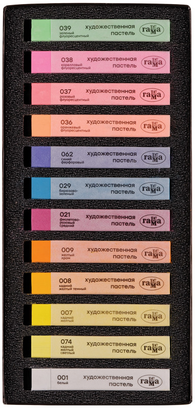 Набор сухой художественной пастели средней мягкости. В наборе мелки квадратной формы в индивидуальной бумажной гильзе с указанием цвета. Пастель легко наносится, смешивается и растушевывается. Цвета в наборе яркие, насыщенные, светостойкие. Флуоресцентные цвета устойчивые.