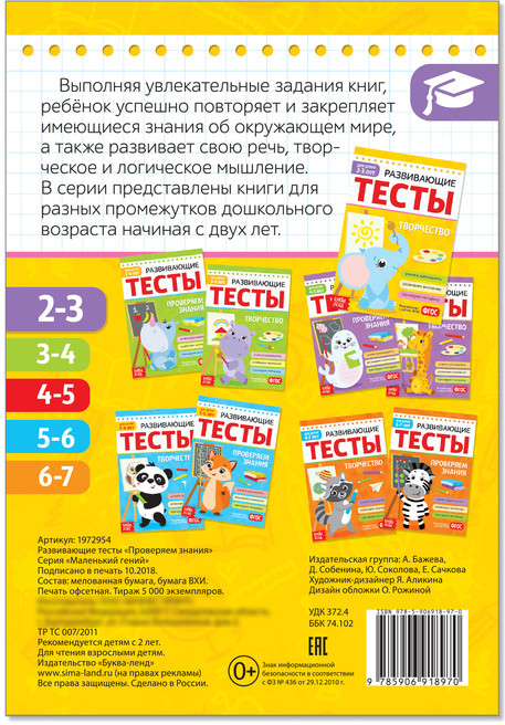 Тесты развивающие для детей «Знания»В данный момент этот товар отсутствует в продаже. Возможно, у нас найдется аналогичный или похожий товар здесь. Серия: Развивающие тесты «Развивающие тесты. Знания» разработаны с учётом возрастных и психологических особенностей детей. В этих книгах вас ждут увлекательные задания, которые затрагивают основные аспекты интеллектуального развития малышей. Страница за страницей ребёнок будет решать задачи на логику, счёт и внимание. Научится разгадывать ребусы, находить отличия, работать с текстом и получит новые знания об окружающем мире. Занимайтесь с пользой и удовольствием! |