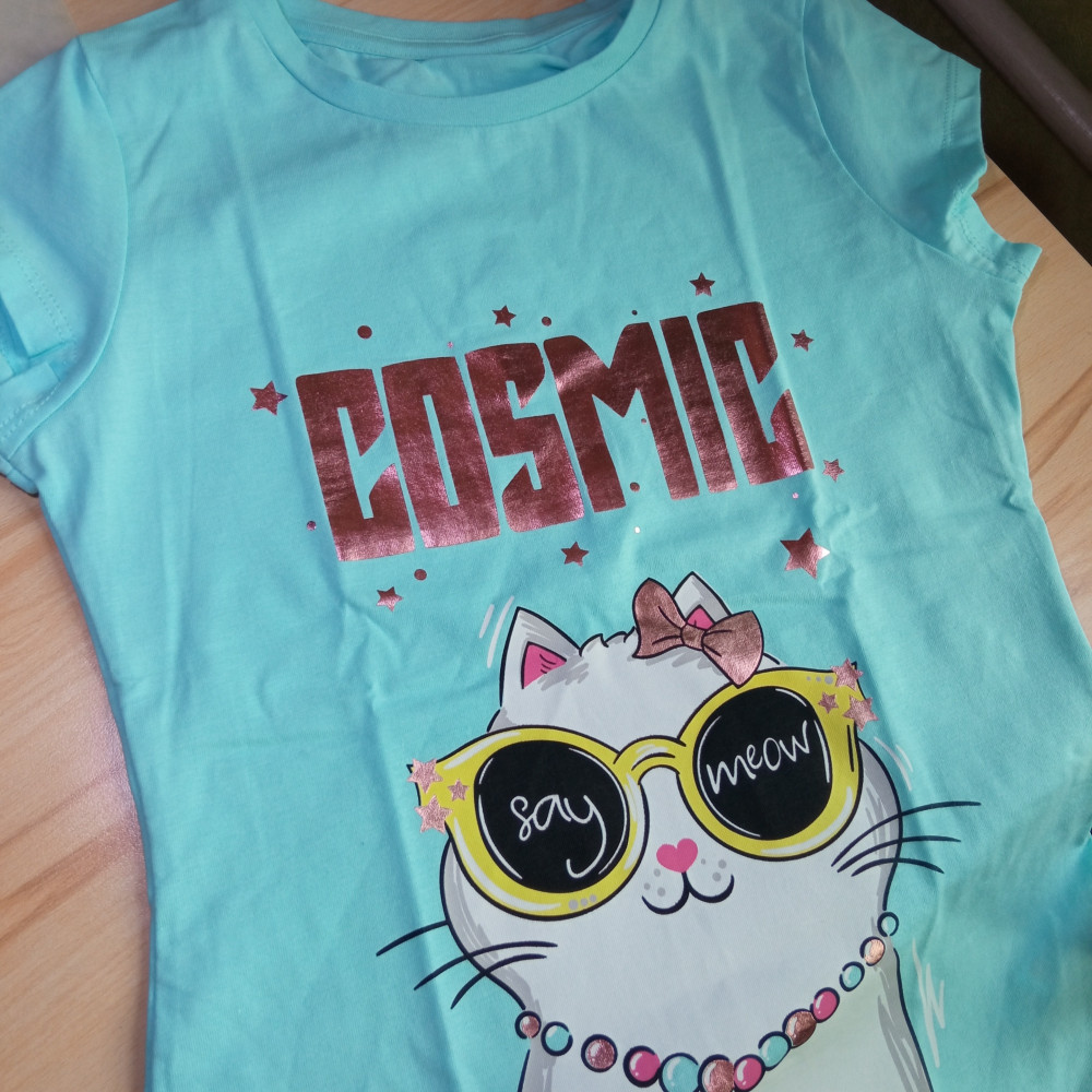 Качество хорошее, футболка даже красивее в реальности, надпись переливается. Маломерка, следует брать на размер больше. На рост 130 подошёл размер 140, футболка для худеньких.