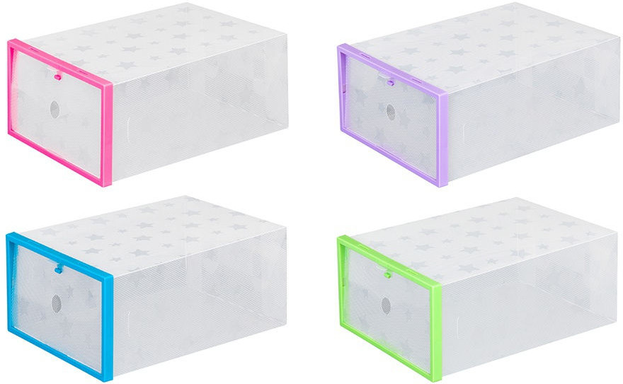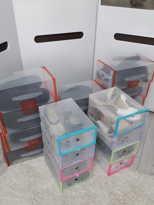 Набор коробок понравился. Пластик достаточно плотный. Умещается одна пара обуви с каблуками или двое балеток.