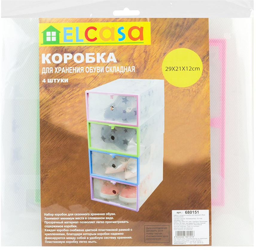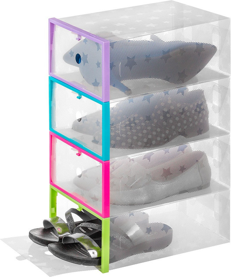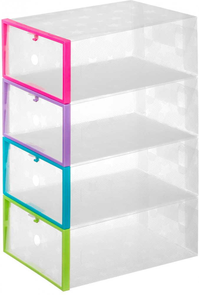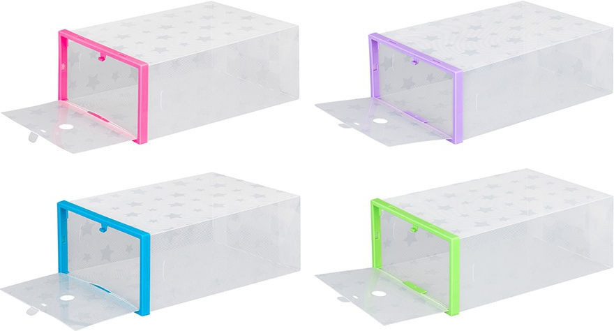 El Casa Набор коробок для хранения обувиВ данный момент этот товар отсутствует в продаже. Возможно, у нас найдется аналогичный или похожий товар здесь. Набор из 4-х прозрачных пластиковых коробок для обуви — прекрасная альтернатива картонным коробкам и пакетам. Все вместе в высоту занимают 48 см. Каждая коробка снабжена цветной пластиковой рамкой, благодаря которой даже издалека можно определить содержимое коробки, если, например, в коробке с голубой рамкой хранить обувь только одного члена семьи. Коробка легко складывается — нужно достать коробку из упаковки, распрямить по сгибам в прямоугольник, заднюю часть сложить в пазы, цветную рамку надеть на верхнюю часть коробки так, чтобы прямоугольный выступ совпал с пазом на коробке. По бокам верхней части коробки расположены ушки, которые необходимо загнуть вовнутрь и плотно вставить рамку. Сложить обувь и закрыть крышку, совместив выемку на крышке с пластиковым крючком на рамке. Коробки выполнены из плотного полипропилена, который надежно защитит вашу обувь от пыли и воздействия солнечных лучей. |