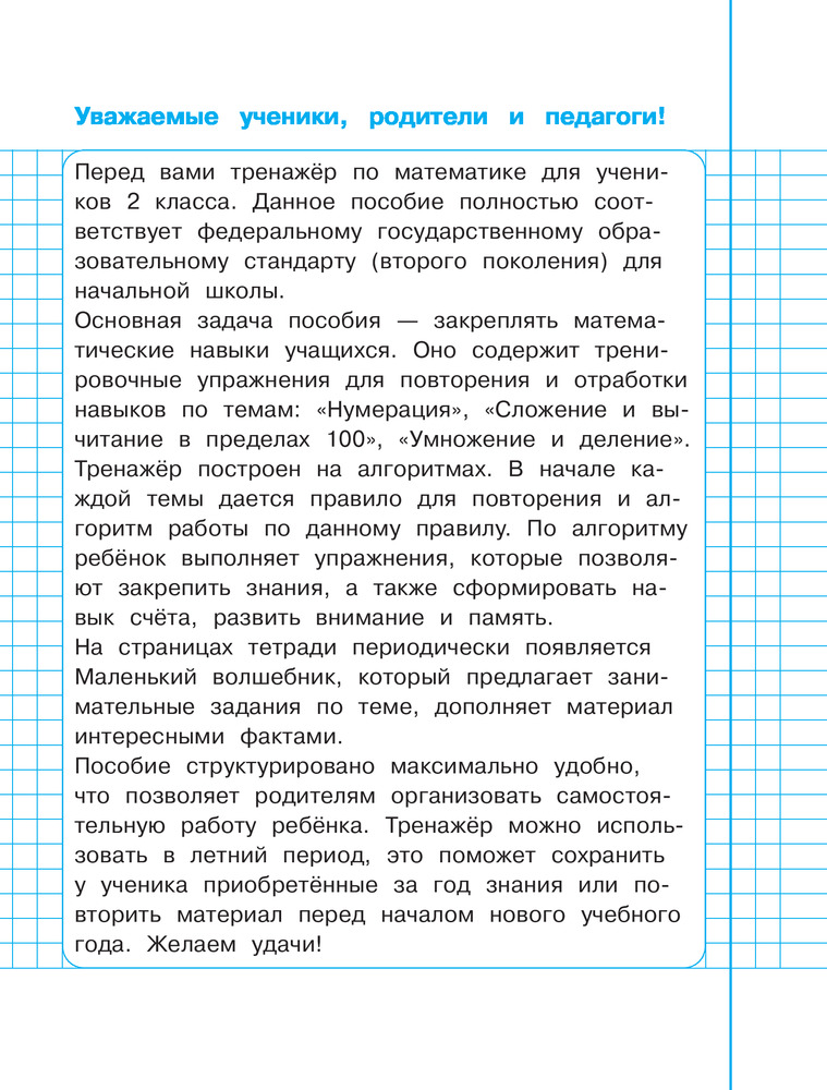 💳 Оплатить за товар можно при получении 🇰🇿 Есть бесплатная доставка по Казахстану 🎁 Копите бонусы с каждой покупки Серия: Тетрадь-тренажер для начальной школы (обложка) Основная задача пособия, соответствующего ФГОС, закрепить полученные в школе знания по основным математическим темам: «Числа и величины», «Арифметические действия», «Текстовые задачи», «Пространственные отношения, «Геометрические фигуры», «Геометрические величины». Регулярная работа с тренажёром позволит повысить успеваемость, интерес учащегося к предмету и создаст условия для формирования логического и абстрактного мышления, а также пространственного воображения у учащихся. Пособие структурировано максимально удобно и поможет отработать навыки и умения школьникам, занимающимся по любой из ныне действующих программ, а родителям организовать самостоятельную работу учащихся. Предназначено для учеников 1 класса, их родителей и учителей начальных классов для повышения эффективности учебного процесса. |