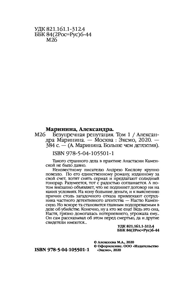 Безупречная репутация. Том 1В данный момент этот товар отсутствует в продаже. Возможно, у нас найдется аналогичный или похожий товар здесь. Серия: А.Маринина. Больше чем детектив. Новое оформление Одно из самых необычных дел Анастасии Каменской. Такого странного дела в практике Анастасии Каменской не было давно. |