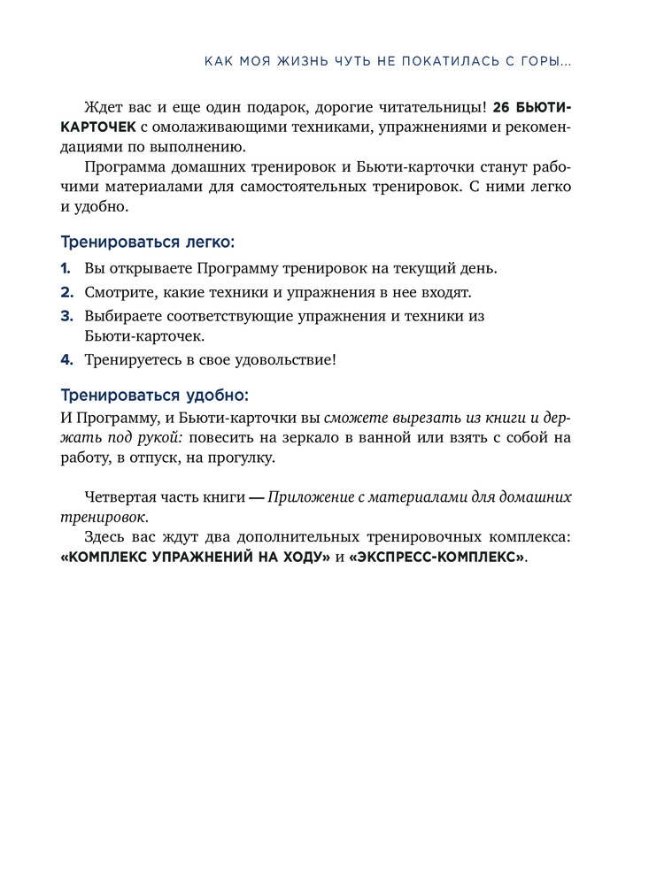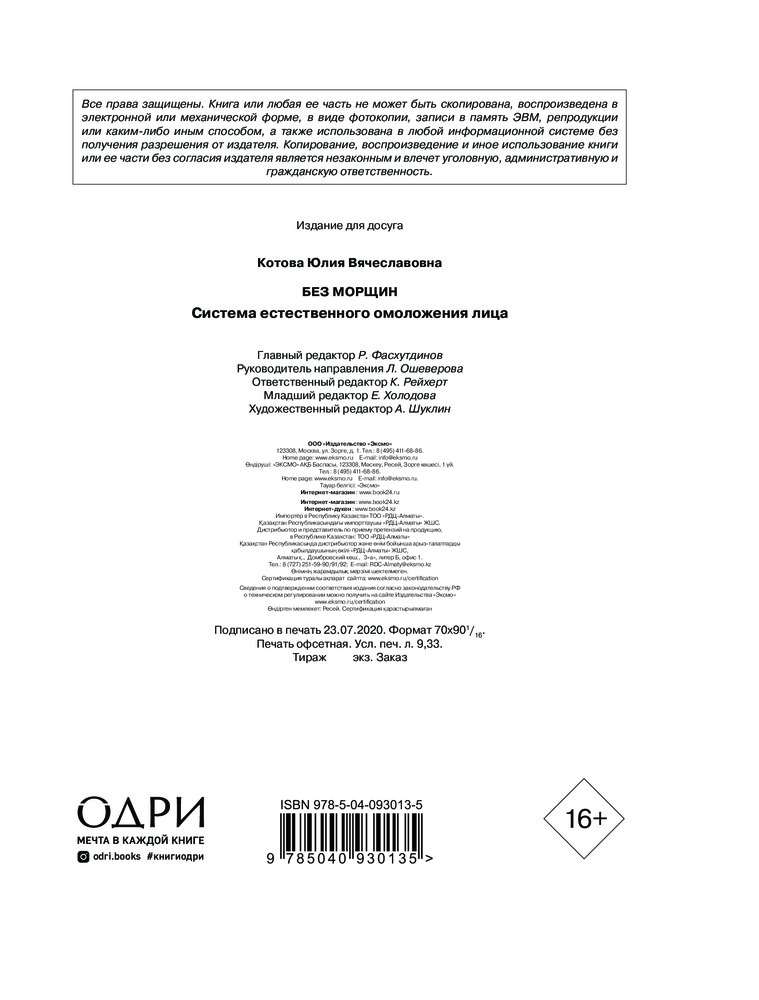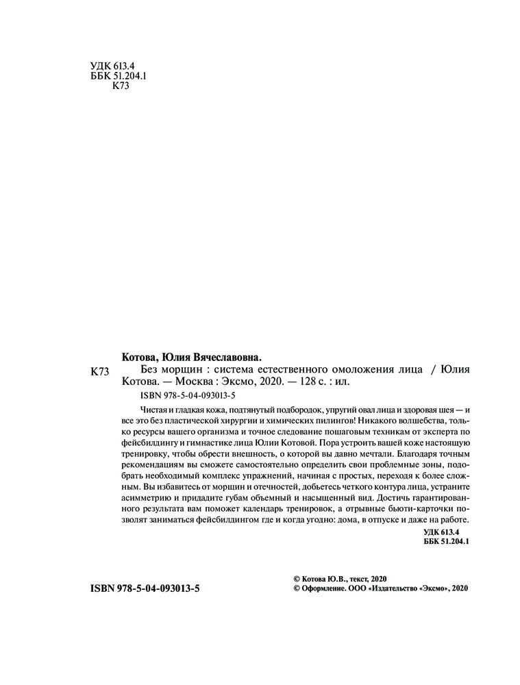 Без морщин. Система естественного омоложения лицаВ данный момент этот товар отсутствует в продаже. Возможно, у нас найдется аналогичный или похожий товар здесь. Серия: Аэробика для лица Чистая и гладкая кожа, подтянутый подбородок, упругий овал лица и здоровая шея — и все это без пластической хирургии и химических пилингов! Никакого волшебства, только ресурсы вашего организма и точное следование пошаговым техникам от эксперта по фэйсбилдингу и гимнастике лица Юлии Котовой. Пора устроить вашей коже настоящую тренировку, чтобы обрести внешность, о которой вы давно мечтали. Благодаря точным рекомендациям вы сможете самостоятельно определить свои проблемные зоны, подобрать необходимый комплекс упражнений, начиная с простых, переходя к более сложным. Вы избавитесь от морщин и отечностей, добьетесь четкого контура лица, устраните асимметрию и придадите губам объемный и насыщенный вид. Достичь гарантированного результата вам поможет календарь тренировок, а отрывные бьюти-карточки позволят заниматься фейсбилдингом где и когда угодно: дома, в отпуске и даже на работе. |