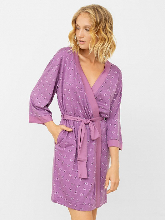 Ткань у халата приятная к телу, обтачка и пояс с шелковистой текстурой. Сшит качественно. Но расцветка в жизни оказалась чуть бледнее, чем на фото, от чего в целом халат выглядит не очень: будто не новый, а претерпевший много стирок. Не маломерит. Взяла с 50% скидкой, поэтому покупкой не разочарована, но за блеклость звезду снимаю.