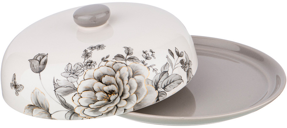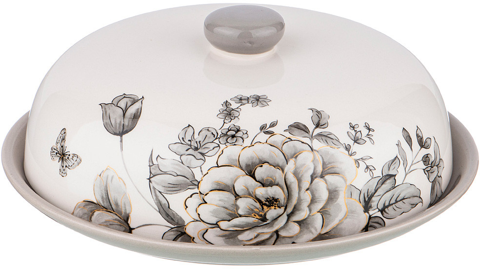 Удобное блюдо с крышкой, красивый рисунок, нежно-серого цвета. Ручка на крышке немного низковата, но не критично. Хорошо сохраняет продукты от высыхания.