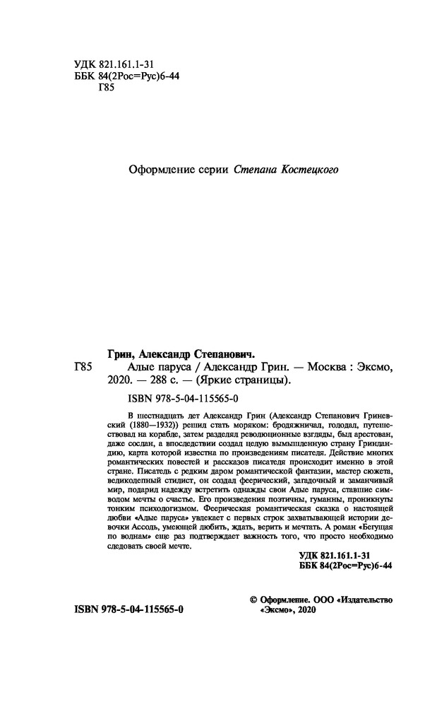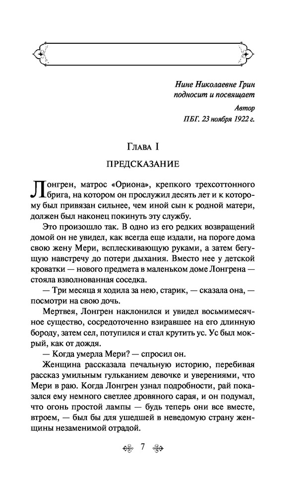 Алые парусаВ данный момент этот товар отсутствует в продаже. Возможно, у нас найдется аналогичный или похожий товар здесь. Серия: Яркие страницы В шестнадцать лет Александр Грин (Александр Степанович Гриневский (1880–1932)) решил стать моряком: бродяжничал, голодал, путешествовал на корабле, затем разделял революционные взгляды, был арестован, даже сослан, а впоследствии создал целую вымышленную страну Гринландию, карта которой известна по произведениям писателя. Действие многих романтических повестей и рассказов писателя происходит именно в этой стране. Писатель с редким даром романтической фантазии, мастер сюжета, великолепный стилист, он создал феерический, загадочный и заманчивый мир, подарил надежду встретить однажды свои Алые паруса, ставшие символом мечты о счастье. Его произведения поэтичны, гуманны, проникнуты тонким психологизмом. Феерическая романтическая сказка о настоящей любви «Алые паруса» увлекает с первых строк захватывающей истории девочки Ассоль, умеющей любить, ждать, верить и мечтать. А роман «Бегущая по волнам» еще раз подтверждает важность того, что просто необходимо следовать своей мечте. |