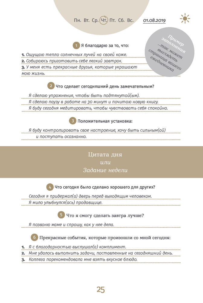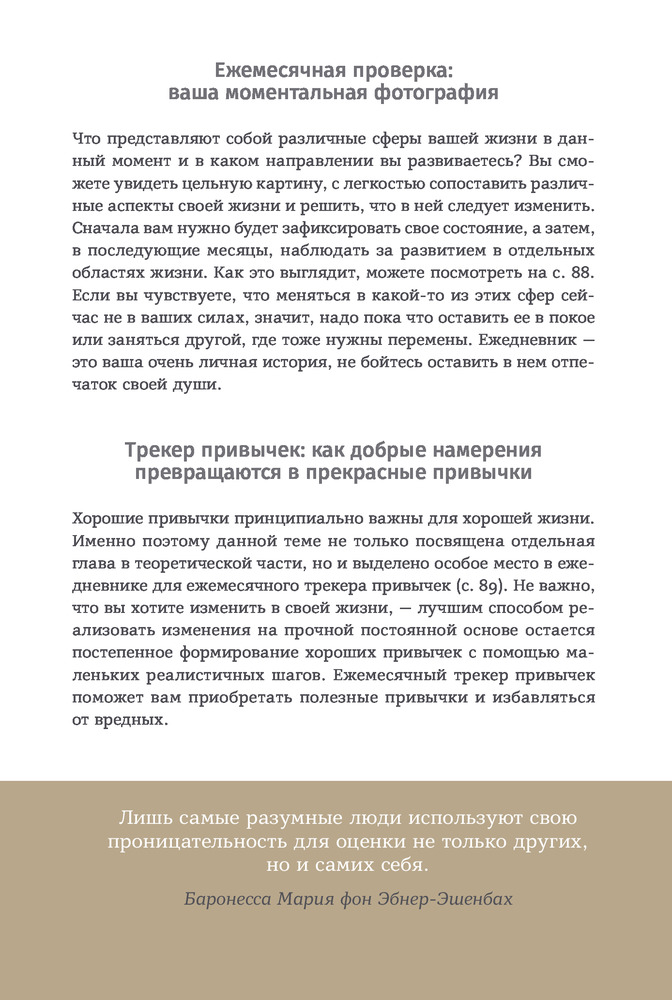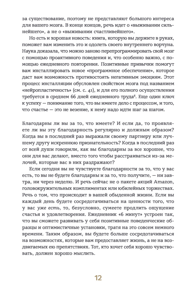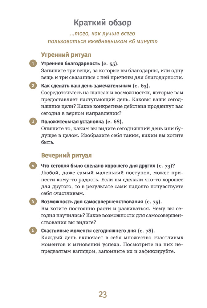 💳 Оплатить за товар можно при получении 🇰🇿 Есть бесплатная доставка по Казахстану 🎁 Копите бонусы с каждой покупки Серия: Ежедневники «6 минут» Счастье не является результатом везения или случайного стечения обстоятельств. Стать счастливым помогают правильные установки и образ мыслей. 3 минуты утром и 3 минуты вечером — столько времени займет выработка полезных привычек, которые сделают вашу жизнь осознаннее, гармоничнее, а значит — счастливее. |