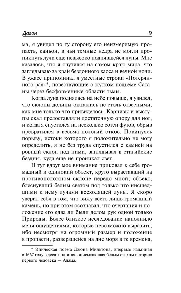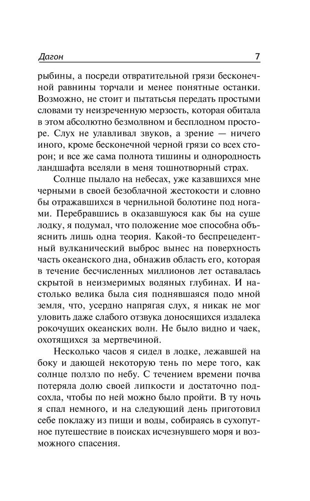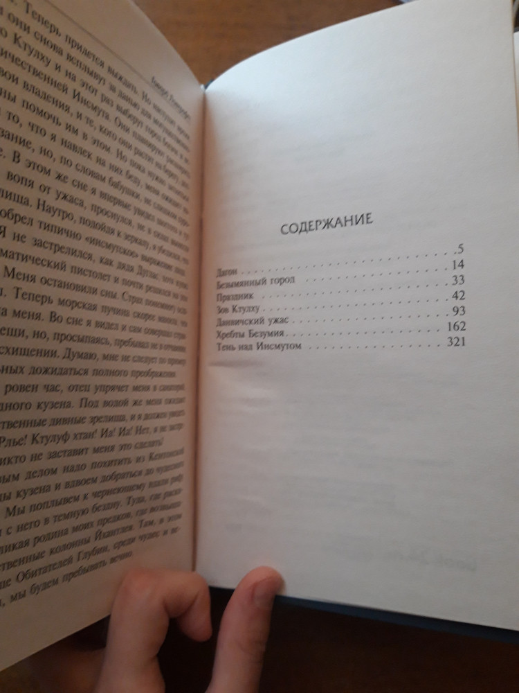 Неплохая книга. Состоит из 6 истории: «Дагон», «Безымянный город», «Праздник», «Зов Ктулху», «Данвический Ужас», «Хребты Безумия» и «Тень над Инсмутом». Самая интересная как по мне - это «Данвический Ужас» и «Тень над Инсмутом». Самая долгая же «Хребты безумия» сто с чем то страниц. А сама книга имеет 414 страниц. Автор описывает те или иные события глубоко и чётко, может даже занять несколько десятков страниц. Советую, хорошая книга.