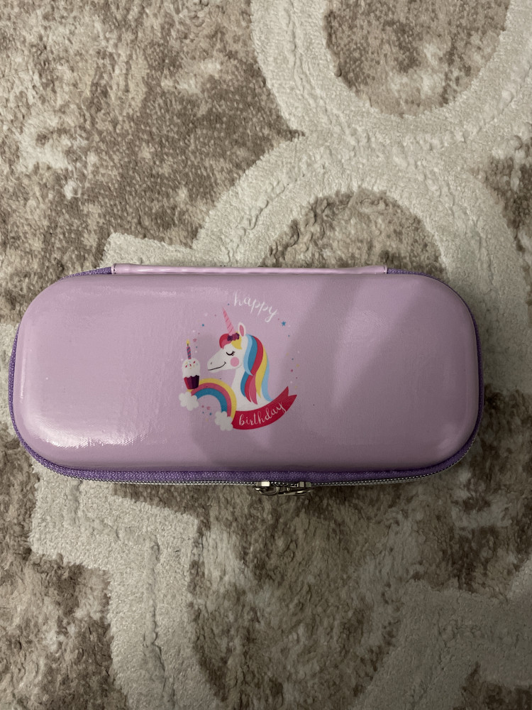 Вроде качество неплохое, но упаковка совсем никакая, пенал пришёл немного грязный (маленькие коричневые точечки на фото это грязь) С обратной стороны единорог и надпись happy birthday которая совсем не к месту на пенале Со скидкой в принципе нормально, но так я бы не рекомендовала