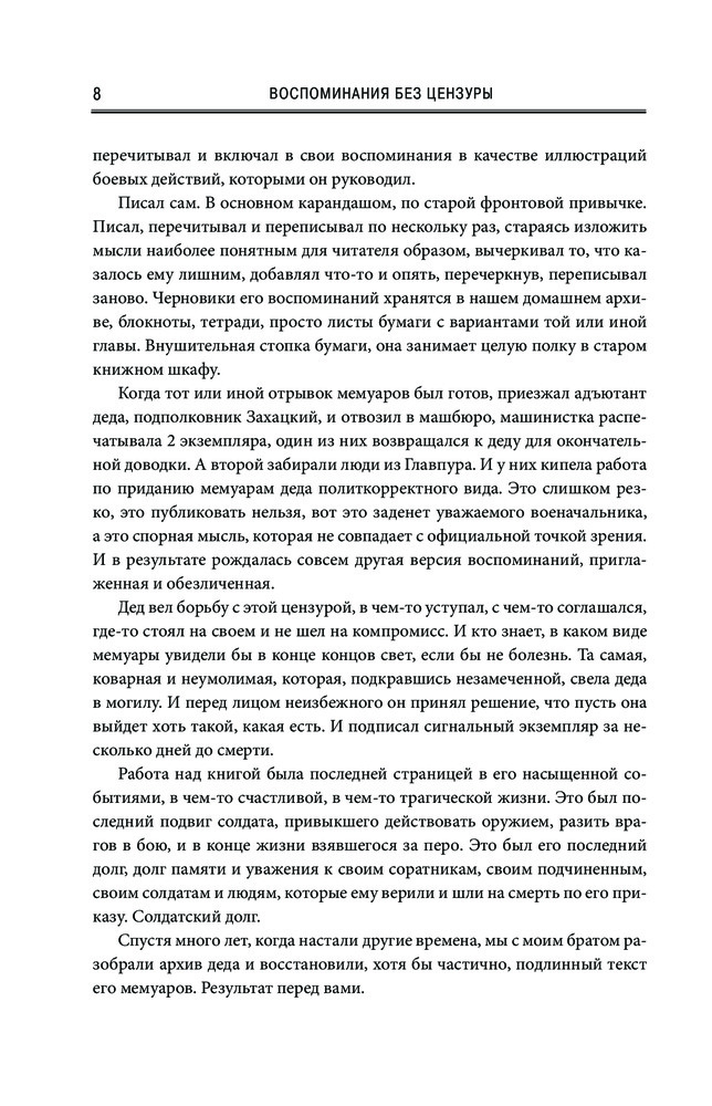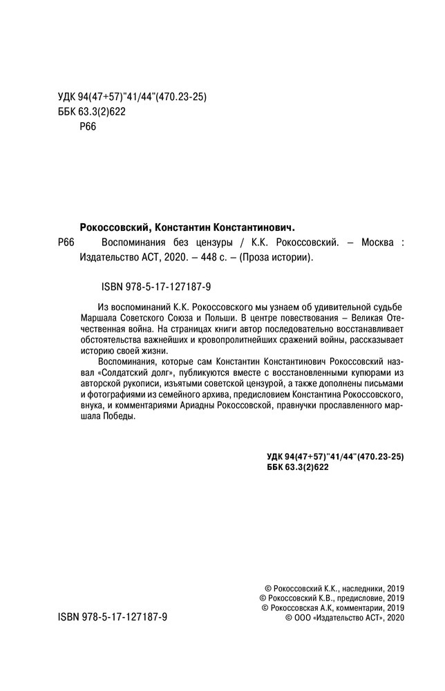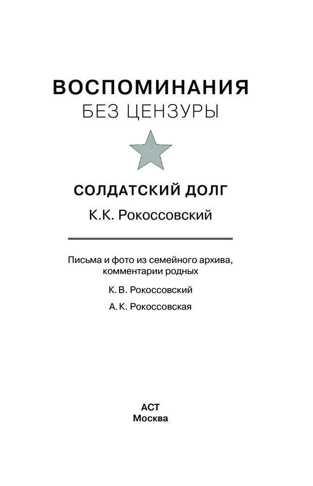 Воспоминания без цензурыКонстантин Константинович Рокоссовский В данный момент этот товар отсутствует в продаже. Возможно, у нас найдется аналогичный или похожий товар здесь. Серия: Проза истории Воспоминания К.К. Рокоссовского рассказывают нам об удивительной судьбе Маршала Советского Союза и Польши. В центре повествования — Великая Отечественная война. На страницах книги автор последовательно восстанавливает обстоятельства важнейших и кровопролитнейших сражений войны, рассказывает историю своей жизни, дав ей название «Солдатский долг».  |