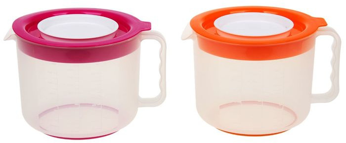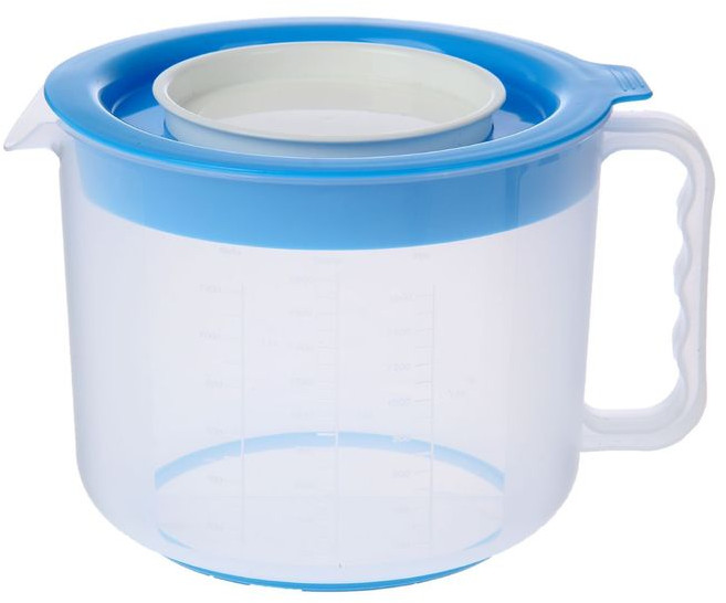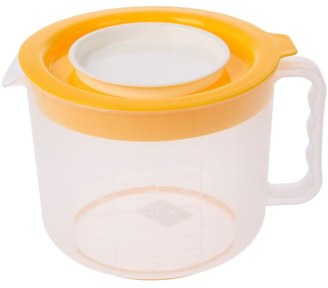 Отличная чаша! Взяла две, одну маме. Очень удобная. Для сравнения с миксером прикладываю фото. В деле ещё не пробовала. Пластик прочный, деления четко видно. Обе крышки снимаются, большую можно повернуть и носик оказывается закрытым, удобно крем в холодильнике держать. Размер в самый раз для взбивания белкового крема. Флип радует отличными товарами без сколов и без трещин при доставке, как это бывает в других интернет-магазинах. Спасибо