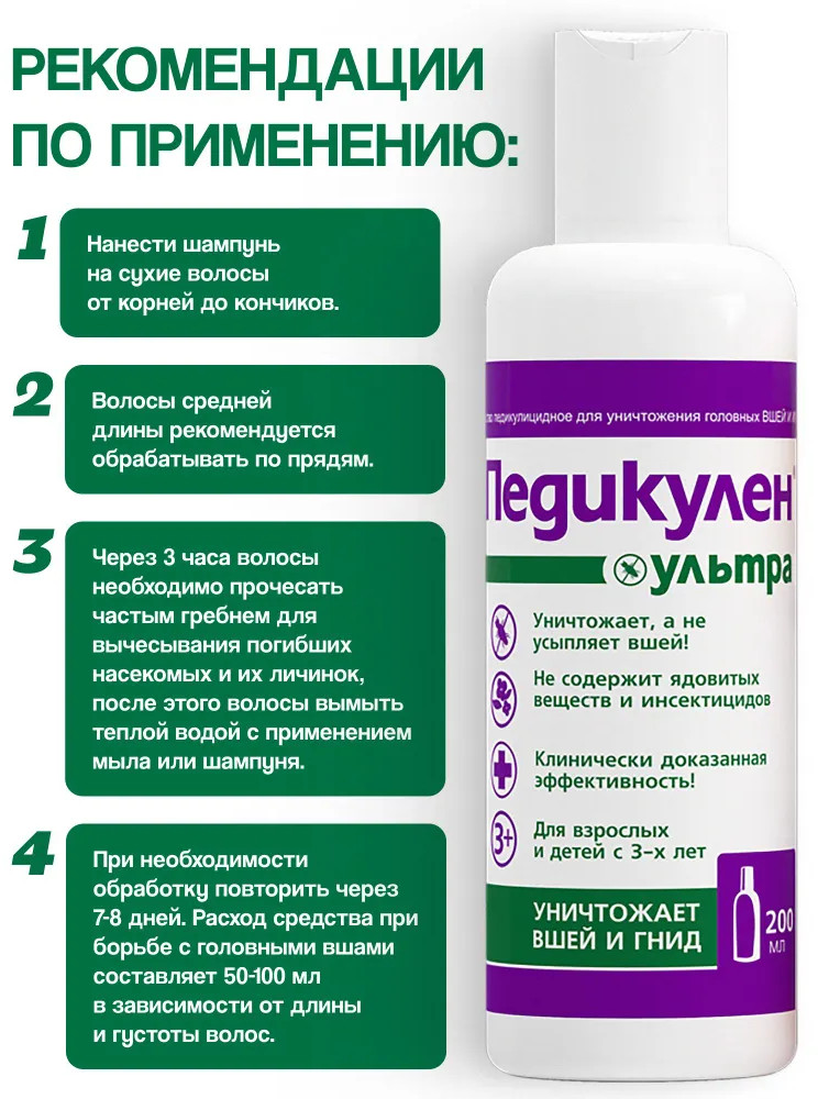 Педикулен ультра Шампунь педикулицидный для волос от вшей и гнидэффективность быстрое действие подходит детям нет гребня В данный момент этот товар отсутствует в продаже. Возможно, у нас найдется аналогичный или похожий товар здесь. Шампунь Педикулен Ультра — надежное средство в борьбе с головными вшами и гнидами. Его уникальная формула обеспечивает быстрое и эффективное уничтожение паразитов, не нанося вреда здоровью. Благодаря клинически доказанной эффективности, вы можете быть уверены в 100% гибели после одного применения. Шампунь для детей и взрослых не содержит ядовитых веществ и инсектицидов, что делает его безопасным для использования даже у детей от 3 лет. Он не просто усыпляет вшей, а уничтожает их окончательно, предотвращая повторное появление. С удобным флаконом объемом 200 мл и специальным диск-топом наносить средство легко и удобно. Помогите себе и своим близким избавиться от вшей на голове с помощью шампуня Педикулен Ультра. Придайте волосам здоровый вид и защитите себя от неприятных ощущений. Мы уверены, что это лучший выбор для вашей семьи! |