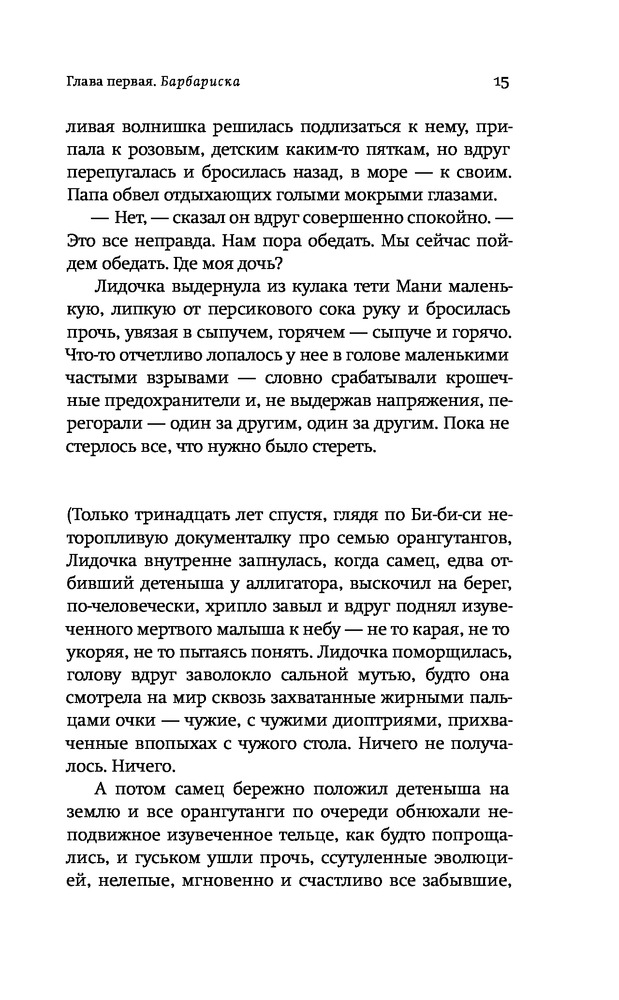 Не поняла смысла написания этого произведения. Сейчас все романом зовётся....Опять такая же проблема, что и с "Садом", название работы не согласуется с самим текстом. Думаю что лучше было бы выпустить серию рассказов, нежели ороманивать истории, которые связаны с собой, родственно, а смысл отсутствует. Этак все будут писать разные истории, называть это крупной литературной формой, а по факту: набор текстов. Слог Марины Степновой , бесспорно, хорош. А вот целостности не чувствую. Ещё одна " очень женская" работа. Это очень видно, а когда видно, уже не очень интересно. В качестве провести 2-3 вечера не у телевизора, не более. Познавательности 0, духовно эмоциональных переживаний не дарит....