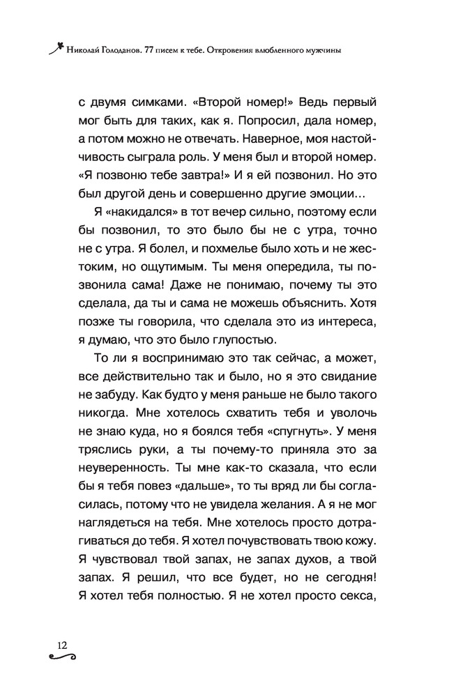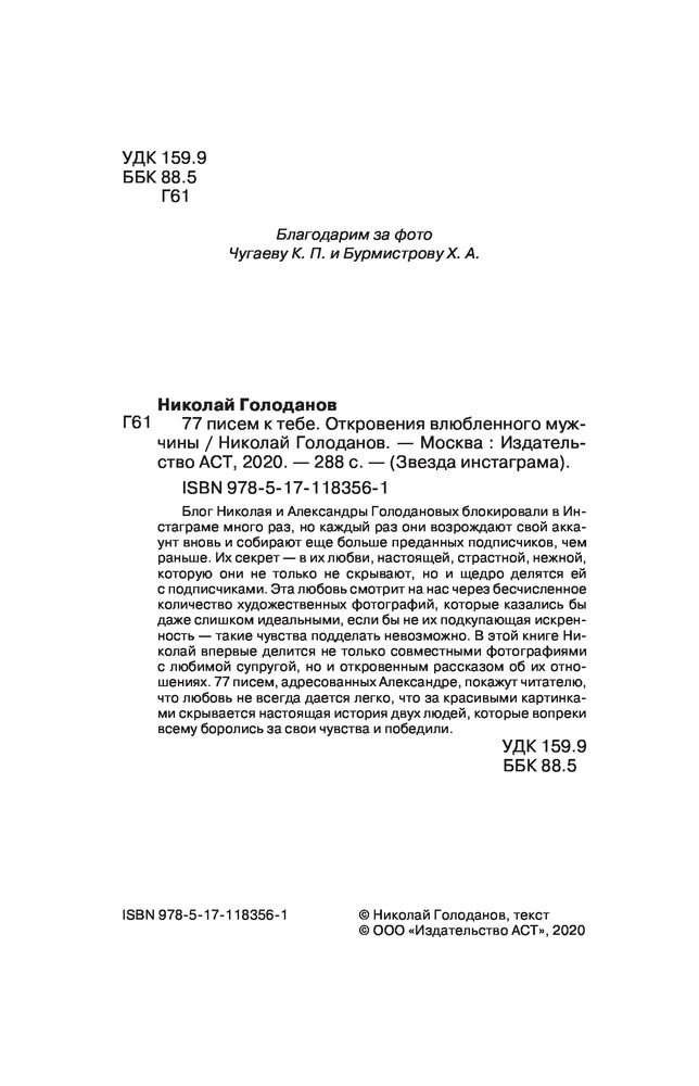 77 писем к тебе. Откровения влюбленного мужчиныВ данный момент этот товар отсутствует в продаже. Возможно, у нас найдется аналогичный или похожий товар здесь. Серия: Звезда инстаграма Блог Николая и Александры Голодановых блокировали в Инстаграме много раз, но каждый раз они возрождают свой аккаунт вновь и собирают еще больше преданных подписчиков, чем раньше. Их секрет — в их любви, настоящей, страстной, нежной, которую они не только не скрывают, но и щедро делятся ей с подписчиками. Эта любовь смотрит на нас через бесчисленное количество художественных фотографий, которые казались бы даже слишком идеальными, если бы не их подкупающая искренность — такие чувства подделать невозможно. В этой книге Николай впервые делится не только совместными фотографиями с любимой супругой, но и откровенным рассказом об их отношениях. 77 писем, адресованных Александре, покажут читателю, что любовь не всегда дается легко, что за красивыми картинками скрывается настоящая история двух людей, которые вопреки всему боролись за свои чувства и победили. |