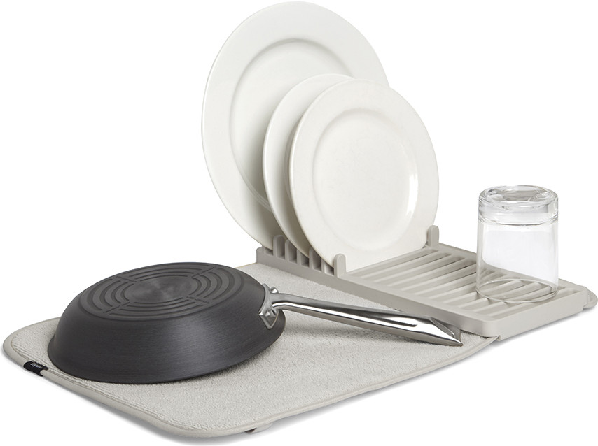Не занимает много места, хорошо впитывает воду, на подставке прочно стоят и тарелки и крышки от кастрюль.