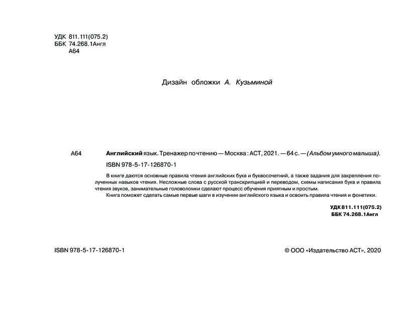 💳 Оплатить за товар можно при получении 🇰🇿 Есть бесплатная доставка по Казахстану 🎁 Копите бонусы с каждой покупки Серия: Альбом умного малыша В книге даются основные правила чтения английских букв и буквосочетний, а также задания для закрепления полученных навыков чтения. Несложные слова с русской транскрипцией и переводом, схемы написания букв и правила чтения звуков, занимательные головоломки сделают процесс обучения приятным и простым. |