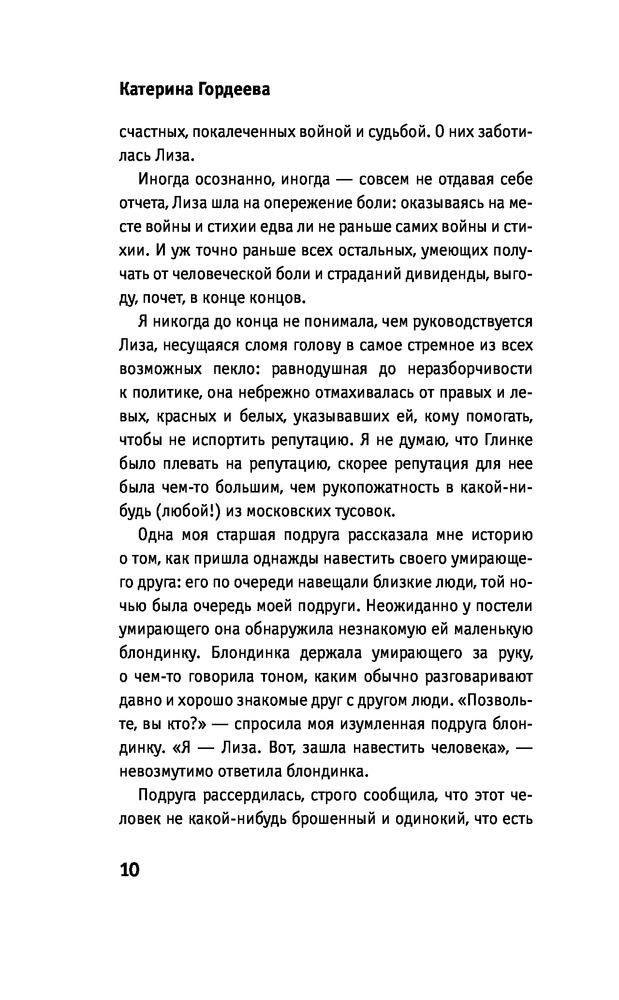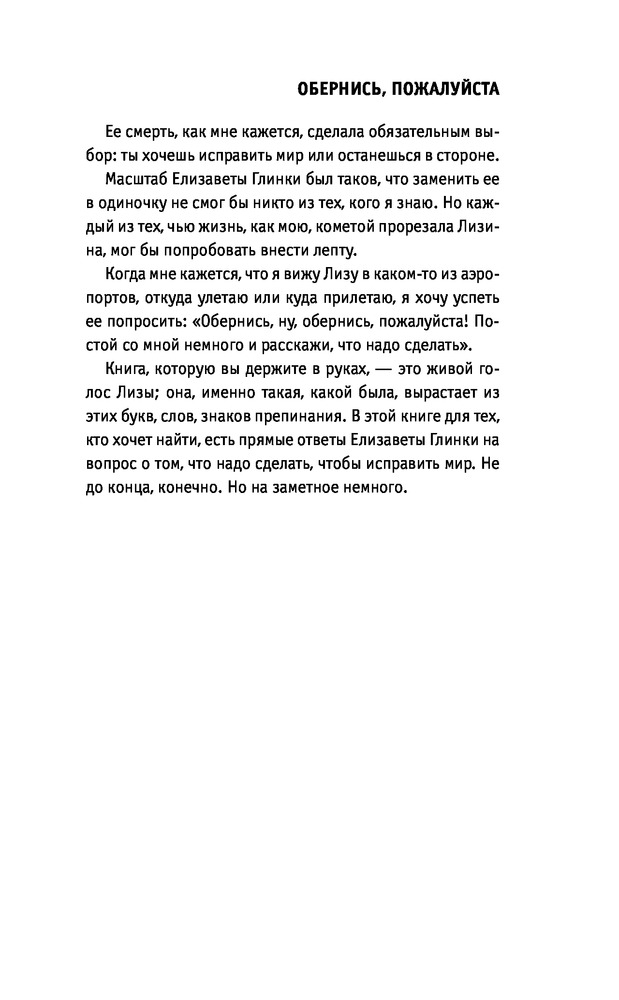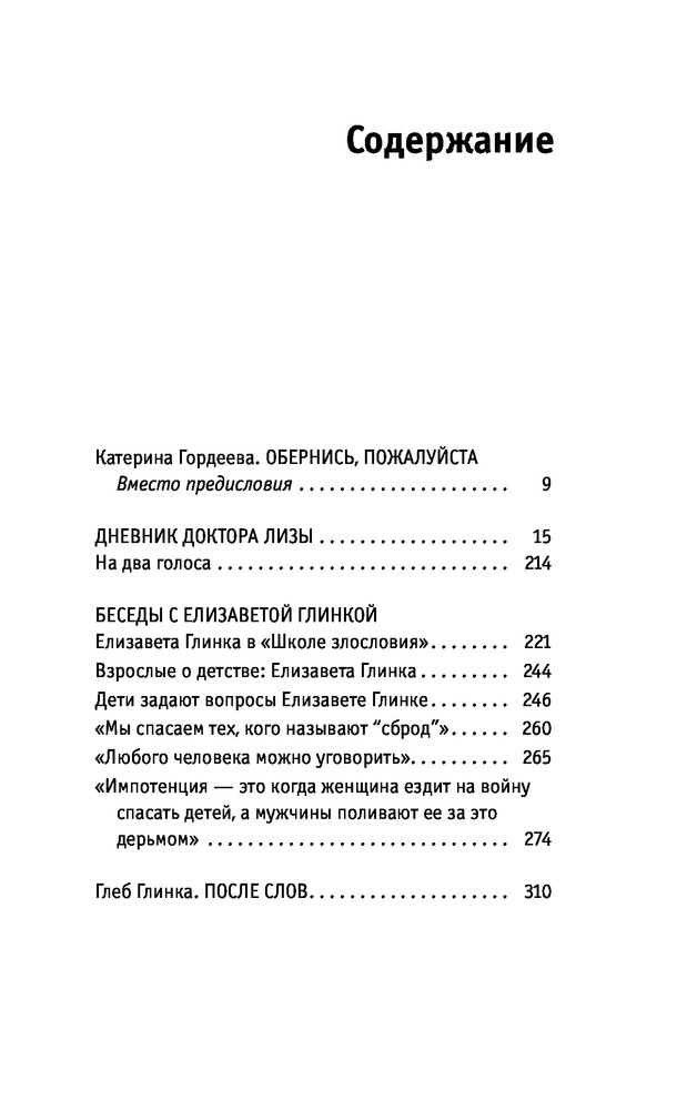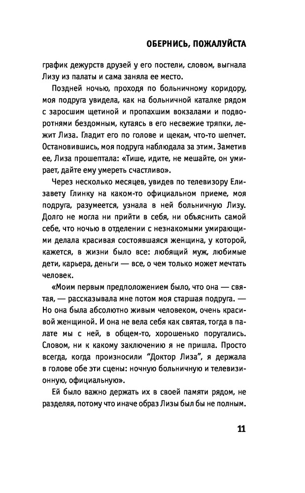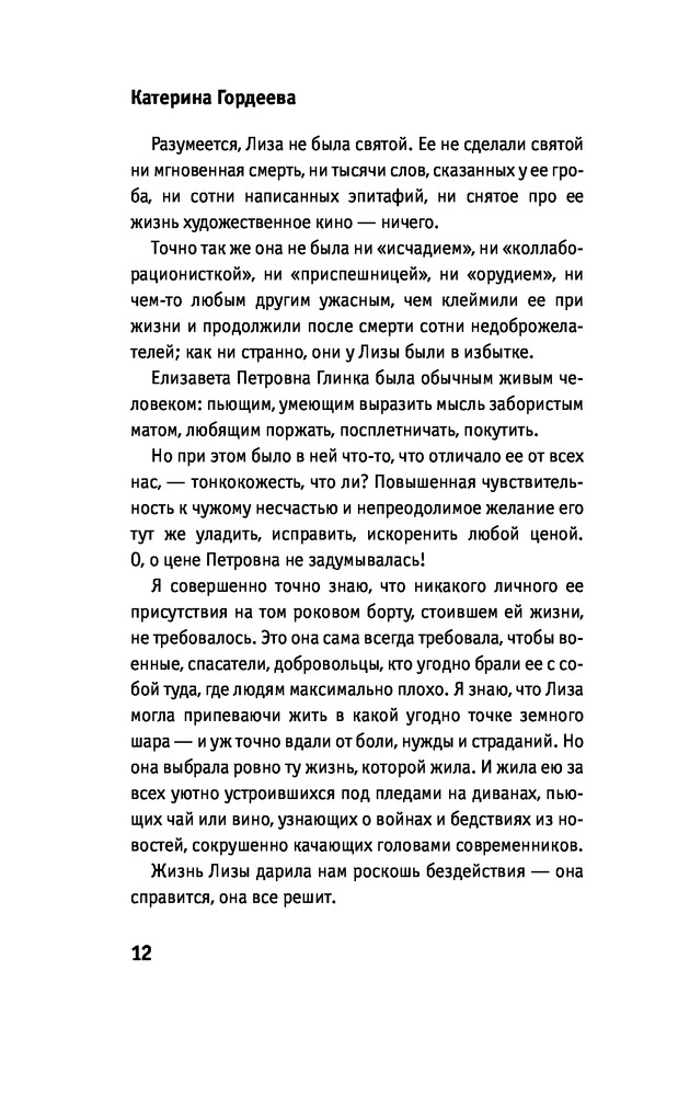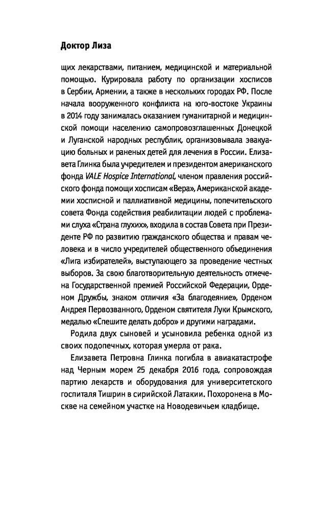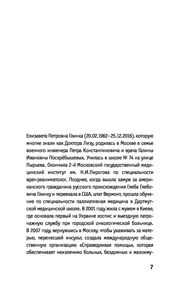 «Доктор Лиза» — это ник, под которым Елизавета Глинка в 2005 году начала вести блог в «Живом журнале», чтобы рассказывать истории больных, проживающих свои последние дни, часы, минуты в основанном ею хосписе в Киеве. Она верила в то, что абсолютно каждый человек, кем бы он ни был в жизни, чем бы ни прославился и что бы ни натворил, имеет право уйти достойно — без боли, без унижений, не брошенный, не забытый. Эту веру она пыталась пробудить и в других. Дневники Доктора Лизы легли в основу этой книги; вторую часть составляют избранные интервью, в которых она много говорит о своей работе, своих подопечных и — совсем немного — о себе. В книгу также вошли мемуарный очерк Глеба Глинки и предисловие Катерины Гордеевой.