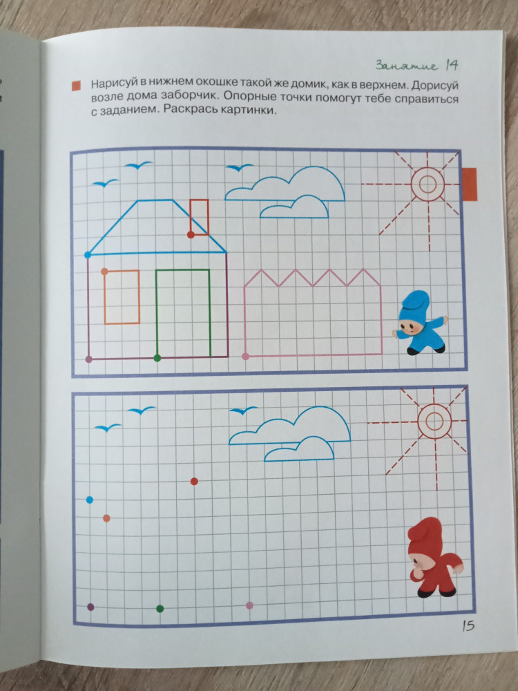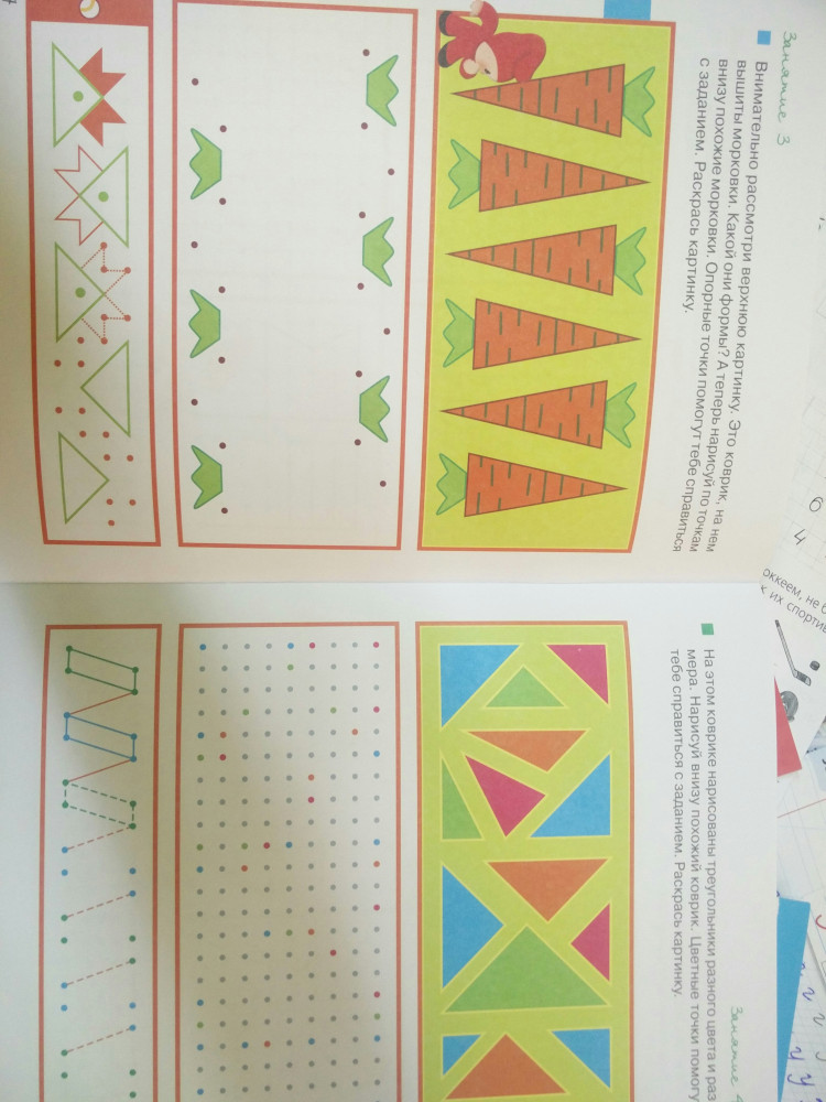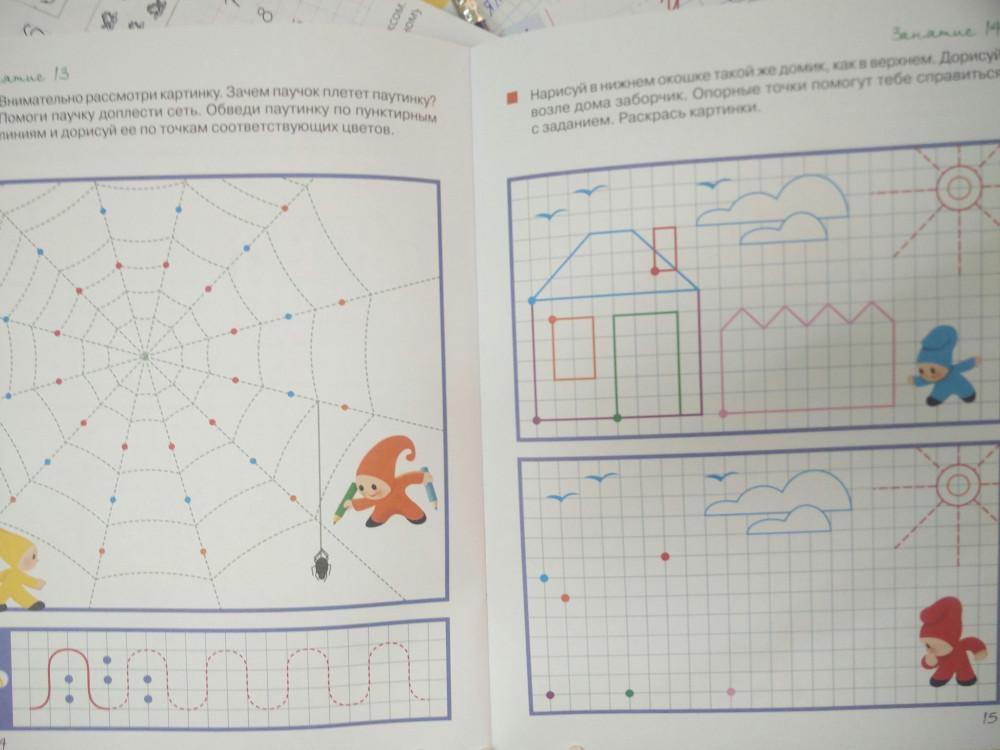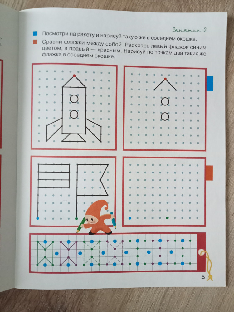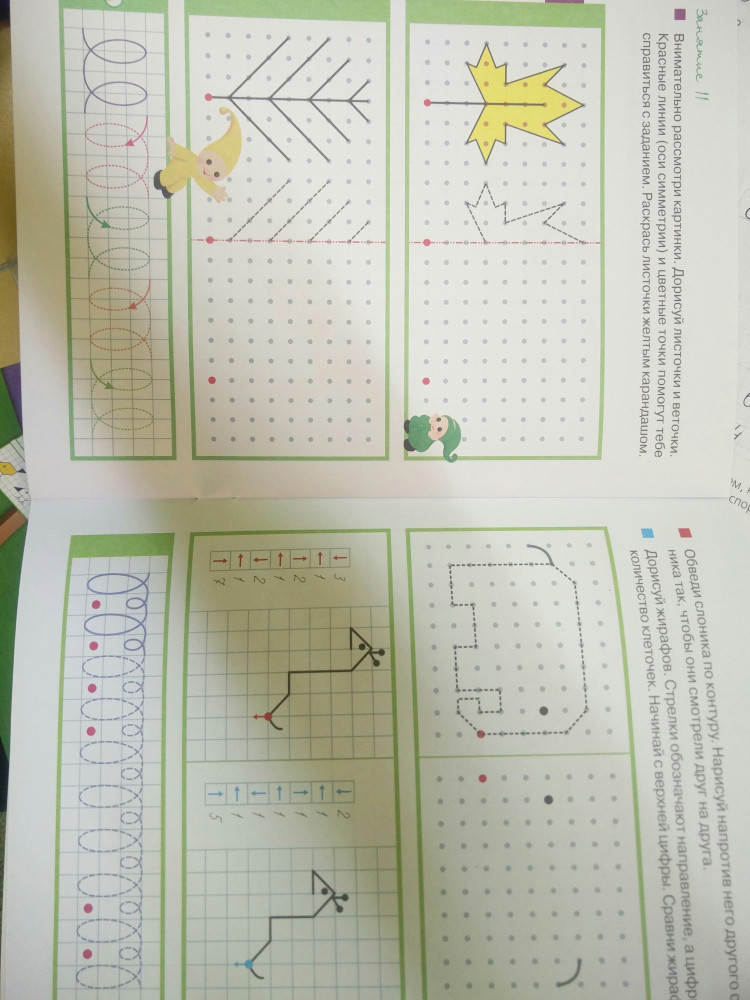 Дочке 5 лет, и ей очень нравится повторять рисунки, считать точки. Бывает ошибается, но в общем для ребенка доступно и понятно.