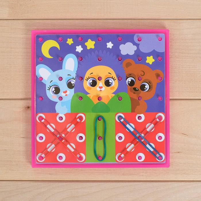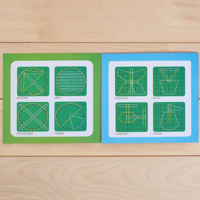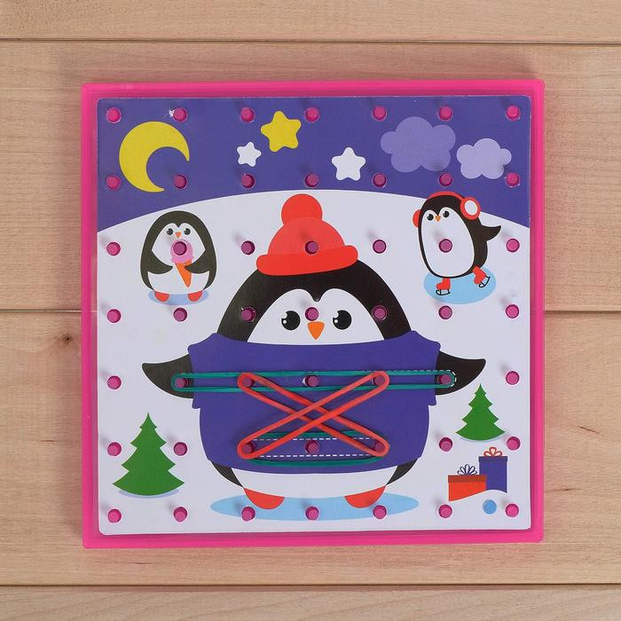 Представляет собой доску со штырьками, к которой прилагаются резиночки и сменные картинки. Резиночки нужно натягивать на штырьки в соответствии со схемами. У вас получатся интересные рисунки с весёлыми зверятами и геометрические фигурки. В наборе есть планшет со штырьками (можно использовать отдельно), брошюра со схемами, 6 игровых полей.