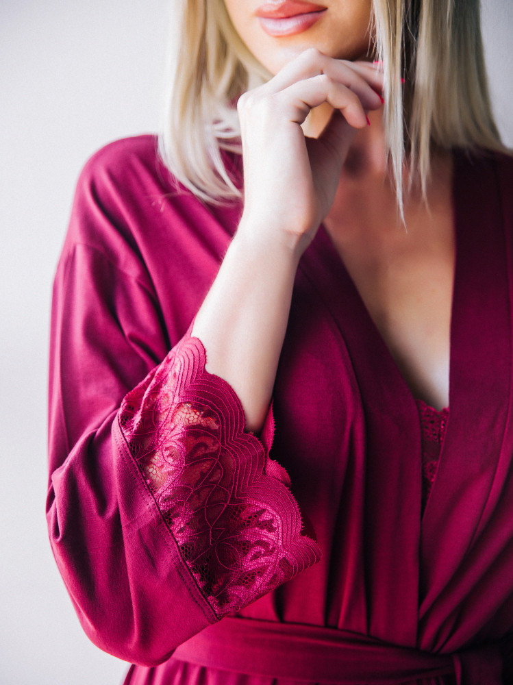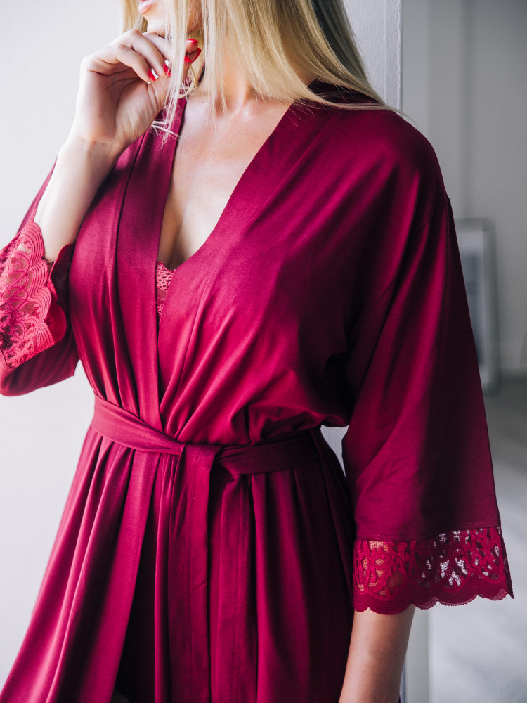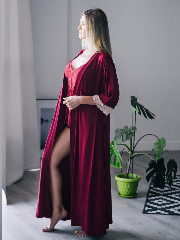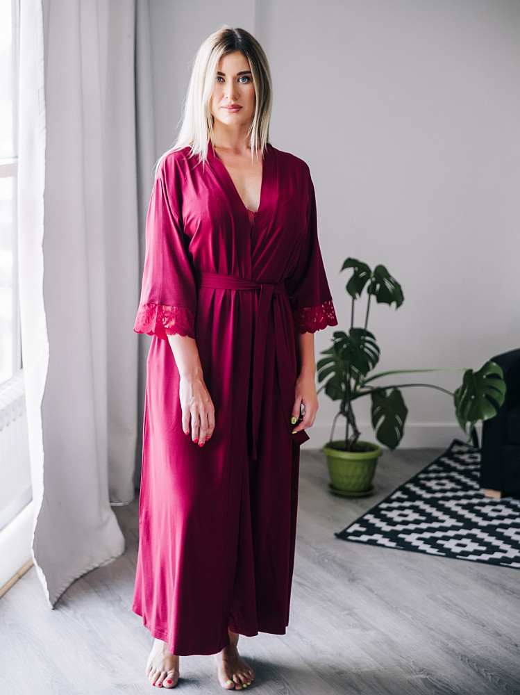 Отличное качество товара, ровные швы, красивое кружево. Халат предназначен для женщин высокого роста. Можно было заказать на размер больше ( 58 ), но его не было в представленной линейке размеров. Материал- вискоза, благородного цвета бордо, тяжелая по весу, хорошо подчеркивает фигуру. Товаром довольна.