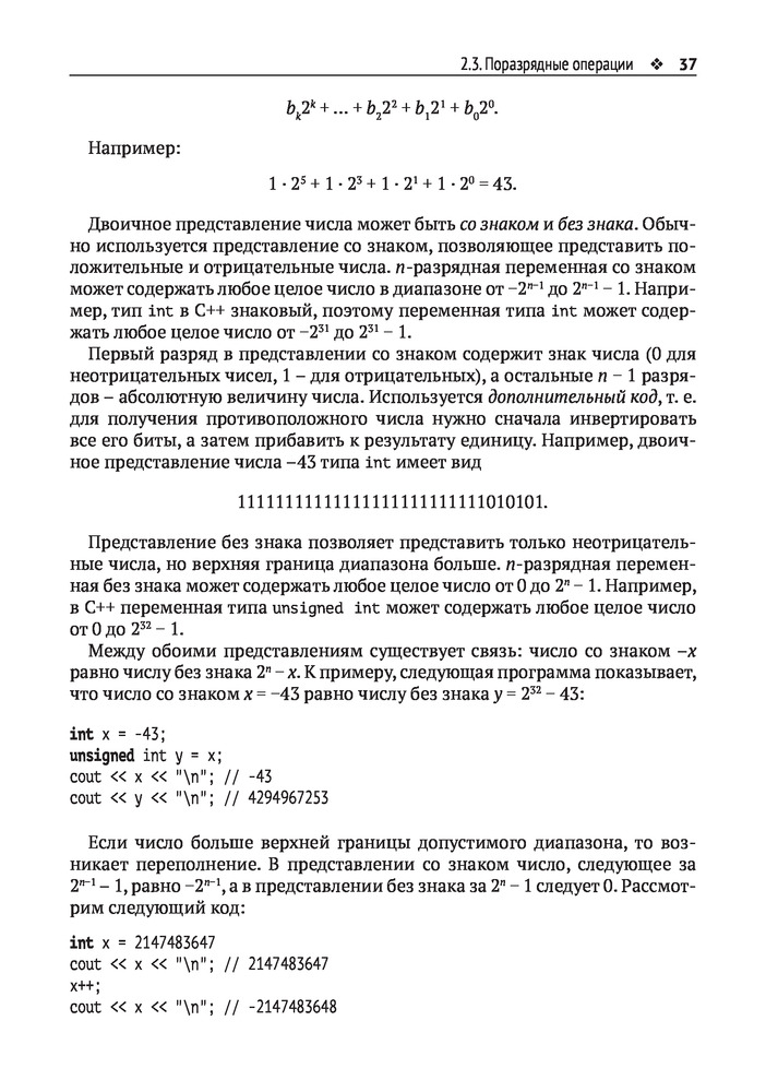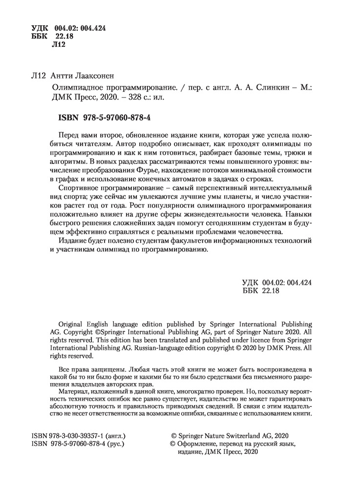Перед вами второе, обновленное издание книги, которая уже успела полюбиться читателям. Автор подробно описывает, как проходят олимпиады по программированию и как к ним готовиться, разбирает базовые темы, трюки и алгоритмы. В новых разделах рассматриваются темы повышенного уровня: вычисление преобразования Фурье, нахождение потоков минимальной стоимости в графах и использование конечных автоматов в задачах о строках. |