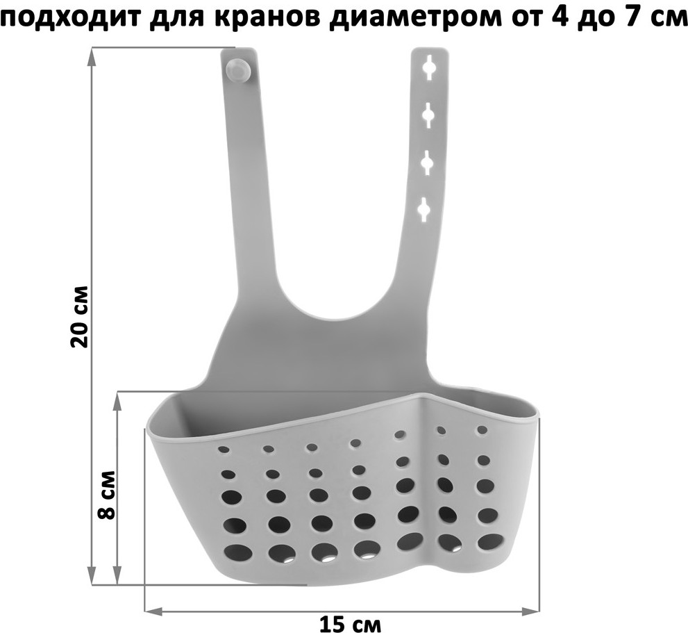 Очень мягкая резина. Не держит форму. Помещается только губка. На кране смотрелось несуразно, повесила на трубу над мойкой.