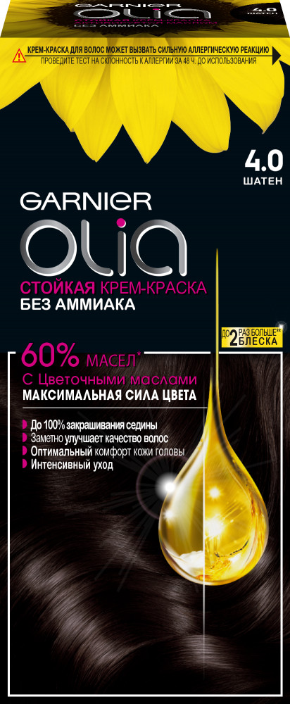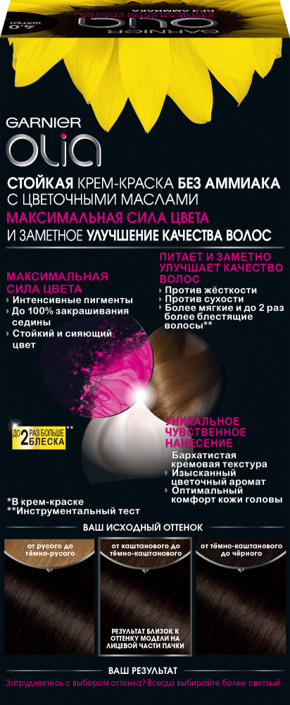 Garnier Стойкая крем-краска для волос «Olia» с цветочными маслами без аммиака, оттенок 4.0 Шатен