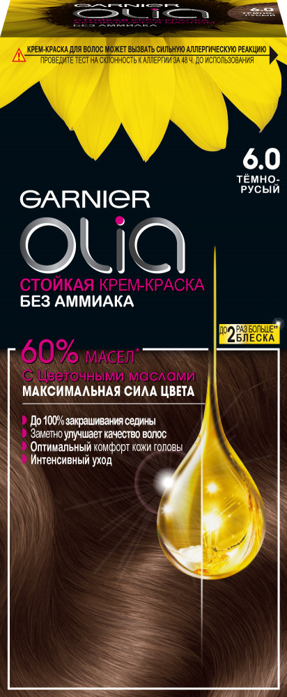 Garnier Стойкая крем-краска для волос «Olia» с цветочными маслами без аммиака, оттенок 6.0 Темно-русый