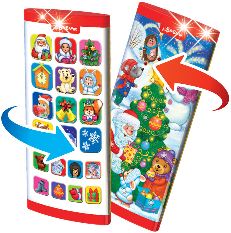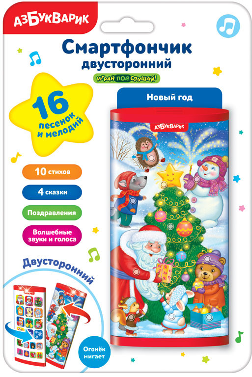 Серия: Двусторонний смартфончик Играть с этим смартфончиком вдвойне интересно — ведь теперь нажимать на звуковые кнопочки можно с двух сторон! 16 песенок и мелодий («Зима», «Расскажи, Снегурочка», «Всех с Новым годом», «В лесу родилась ёлочка», «Кабы не было зимы», «Рождественская песенка», «Белые снежинки» и другие), 10 стихов, 4 сказки («Снегурочка», «Морозко», «Верное средство», «Зимняя сказка»), волшебные звуки — скучать не придётся! А Дед Мороз, Снегурочка и весёлые зверята поздравят с Новым годом и подарят сказочное настроение. |