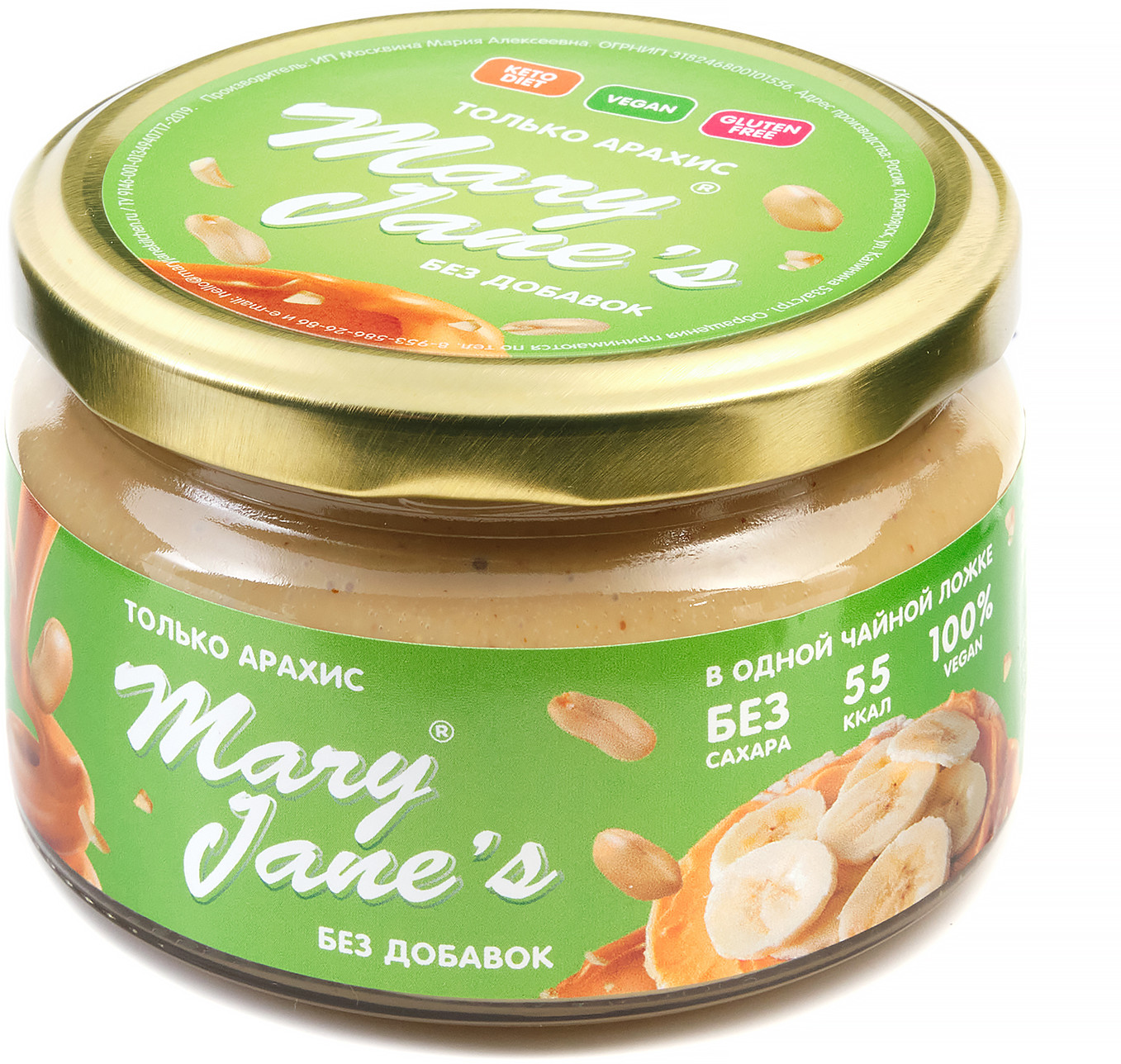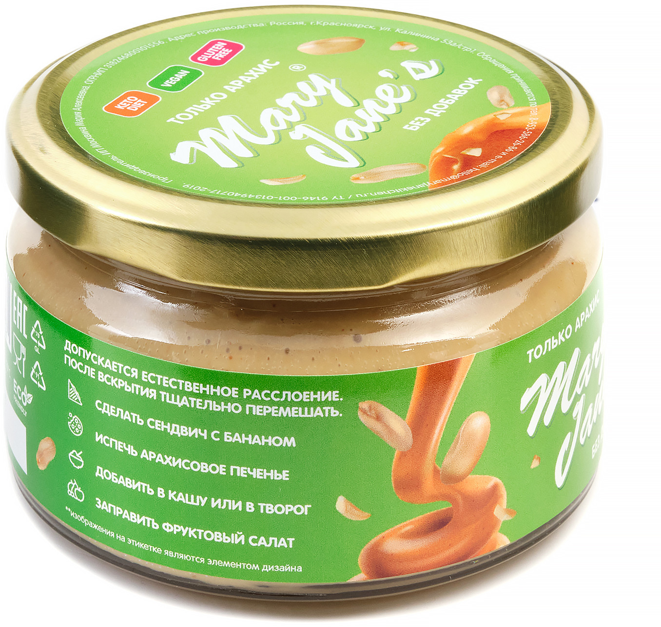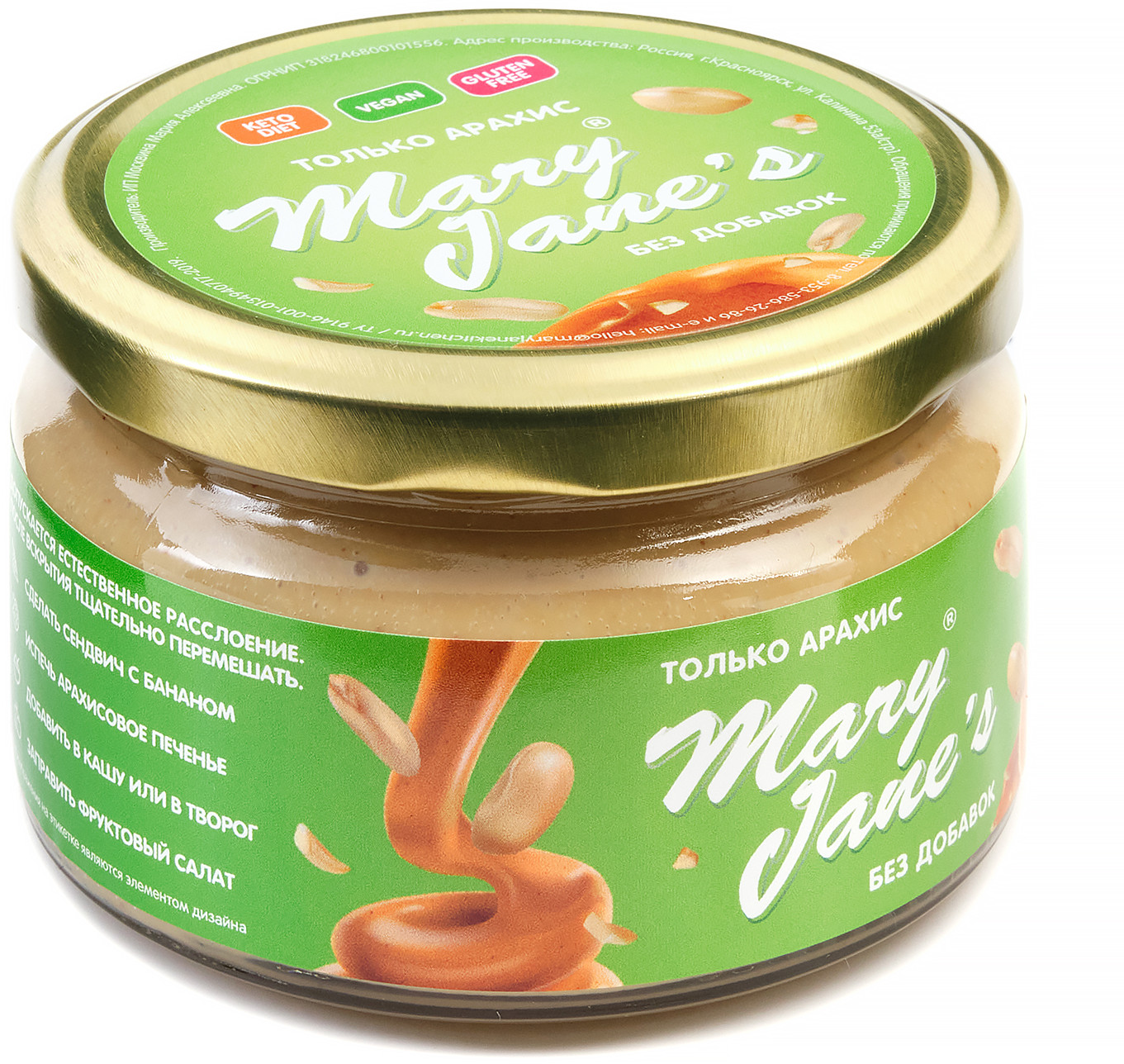 | Арахисовая паста Mary Jane’s Kitchen — без консервантов, наполнителей, подсластителей, эмульгаторов и других добавок или промышленных хитростей, имеет нежно-кремовую консистенцию и восхитительный натуральный вкус! Паста производится в Красноярске малыми партиями, только из свежих поставок сладких сортов арахиса, только из цельных орехов лучшего качества. |