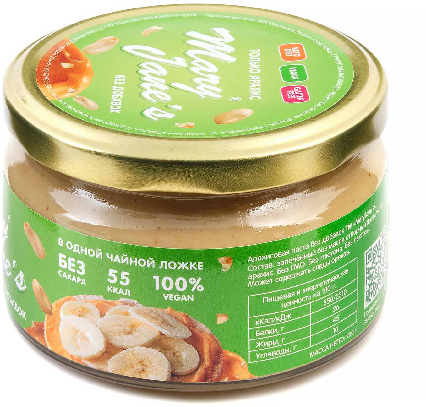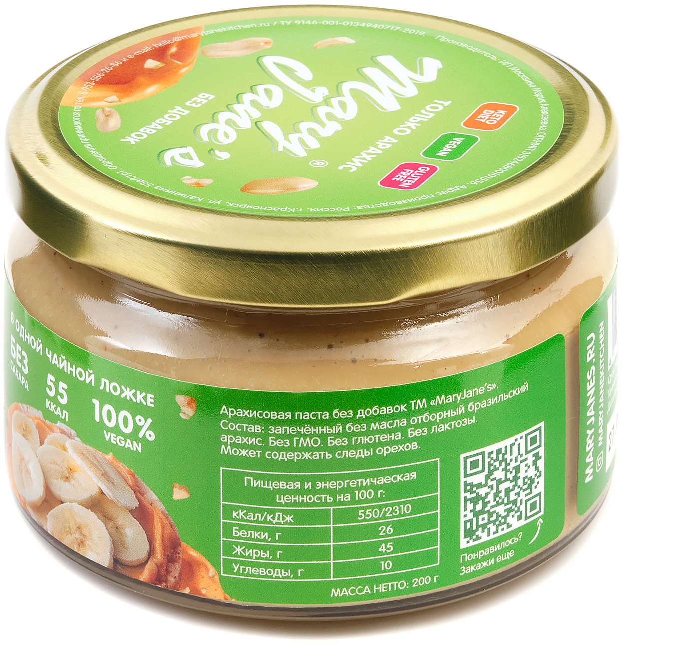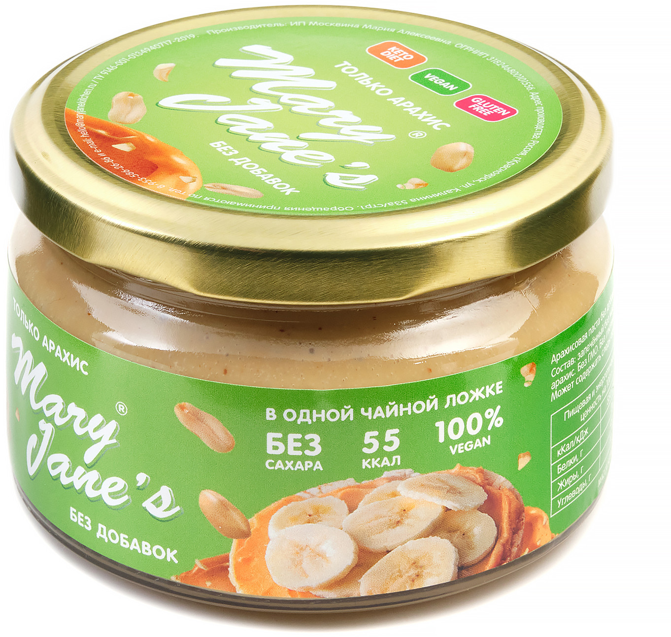 | Арахисовая паста Mary Jane’s Kitchen — без консервантов, наполнителей, подсластителей, эмульгаторов и других добавок или промышленных хитростей, имеет нежно-кремовую консистенцию и восхитительный натуральный вкус! Паста производится в Красноярске малыми партиями, только из свежих поставок сладких сортов арахиса, только из цельных орехов лучшего качества. |
