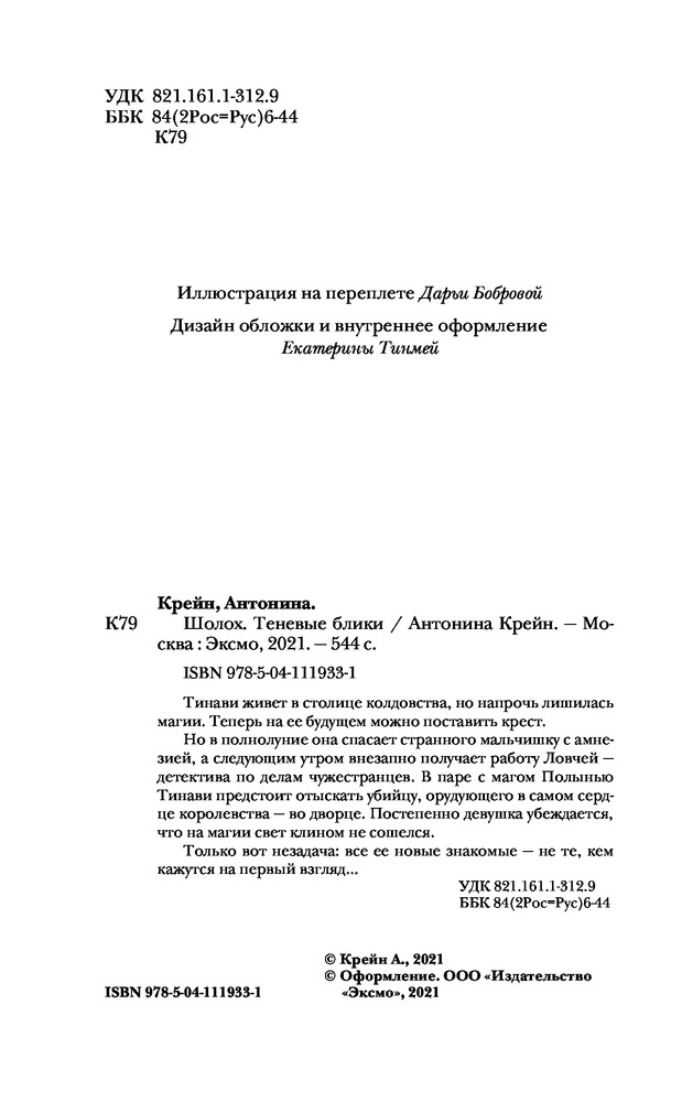Дополняю прошлый отзыв. Со слов дочери: Эта книга открывает дверь в другую вселенную! Захватывающее приключение в магическом мире, в которому хочется оставаться на долго. Изначально думала, что раз русский автор, то книга будет не очень, но ошиблась. Есть пробелы, ошибки (именно сюжетные), неувязки, но от них книга хуже не становится. Начну с внешнего и внутреннего оформления. Страницы тонкие, серые, шрифт достаточно маленький, на одной странице 36-37 строчек. Обложка невероятная. Очень красивая. Цвета сочетаются друг с другом, придают книге магическую атмосферу. Слова "теневые блики" и "в полнолуние запирай двери" переливаются. Особенно понравился стиль букв "Шолох", а конкретно эффект блеска. Ну а теперь про содержание. Повествование ведётся от первого лица, то есть, от лица главной героини. Интересные и неожиданные сюжетные повороты, о которых я сама не догадалась бы, красивое описание мест, помещений. Также хочу отметить, что Антонине нравится делать пробелы между диалогами. Например, обращается главная героиня к другому персонажу, и между её обращением и ответом персонажа писательница вставляет краткий пересказ событий - как они тут оказались, что произошло до обращения, что персонаж делал, и т.п. Тем не менее, это не делает книгу скучнее или хуже, а наоборот, рассказывает нам то, что мы ещё не узнали. Ещё хотелось бы отметить стиль - от веселого и простого детского повествования до серьезного и профессионального повествования. Какие либо события, воспоминания или описания Антонина описывает игриво и весело, употребляя такие слова, как "че", "фигня", и т.п., но это скорее показывает средневековье, ведь в средневековье так и разговаривали(грамотных то не слишком много было, часто ведь говорили "шоль" и "шо ли"), или для того, чтобы подросткам было понятнее читать. Проще говоря, эти слова не являются особым минусом. Огромный плюс, которому я очень хочу выделить строчку, посвящается энциклопедии "Доронах" на последних страницах, где написаны определения некоторых слов, понятий, мест, а также географическая история Шолоха. Часто заглядывала туда, когда не очень понимала какие то места или названия. Ну и в заключении хочу сказать, что от книги веет теплом. Её можно читать в любой атмосфере, хотя я рекомендую для отдыха. Стоит ли её читать? Безусловно, да. Спасибо, flip!