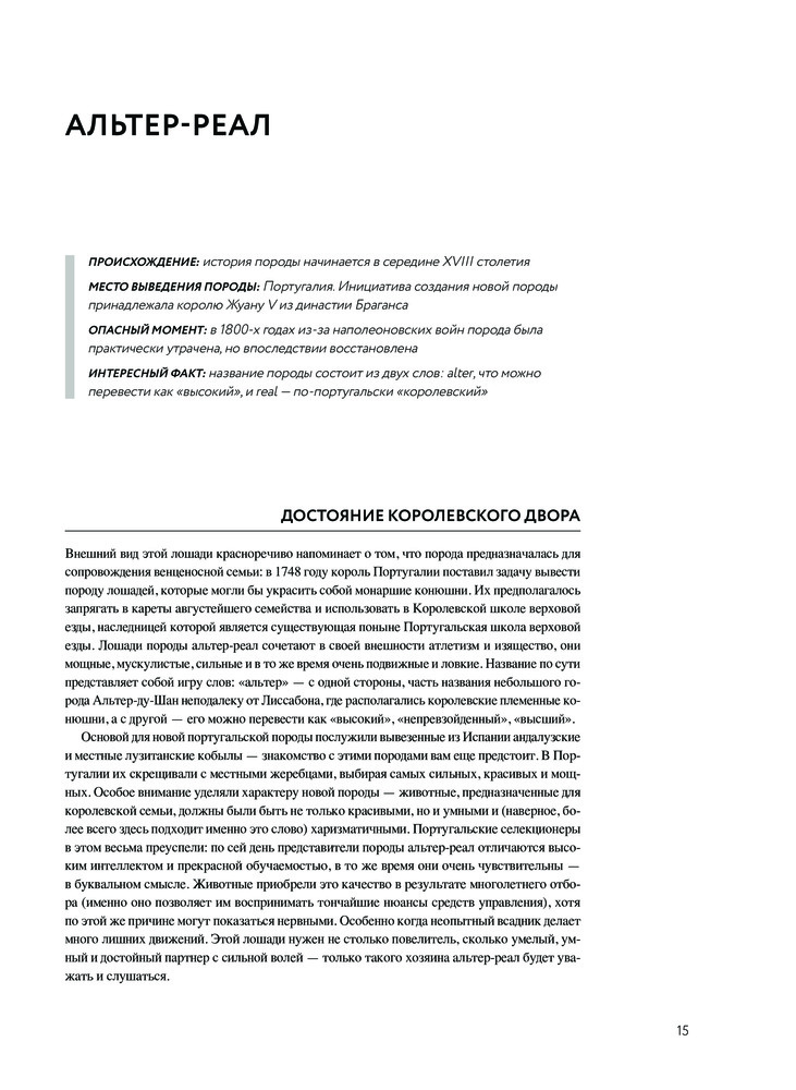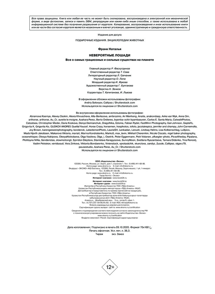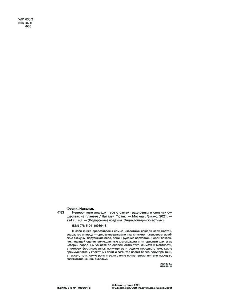 Серия: Подарочные издания. Энциклопедии животных В этой книге представлены самые известные лошади всех мастей, возрастов и пород — орловские рысаки и итальянские тяжеловозы, арабские скакуны, перуанские пасо, пони и русские верховые. Любой поклонник лошадей оценит великолепные фотографии и интересные факты из истории пород. Вы узнаете об особенностях того климата и местности, в которых формировались популярные и редкие породы, о том, какие преимущества у крохотных пони и гигантов весом более полутора тонн, а также о том, какую роль играли самые яркие представители пород во взаимоотношениях с людьми. |