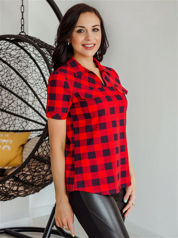 Брала на размер больше. Ткань средней плотности, мягкий трикотаж, тянется несильно. Клеточки - принт, изнанка синяя. Низ закруглён, покрой прямой. Сшито аккуратно. Цвет не такой яркий, как на фото.