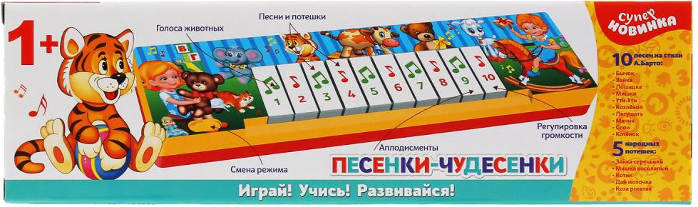 Ребёнок с удовольствием будет нажимать на клавиши и слушать весёлые песенки и потешки. Перейдя в другой режим, малыш сможет придумать и наиграть собственную мелодию.