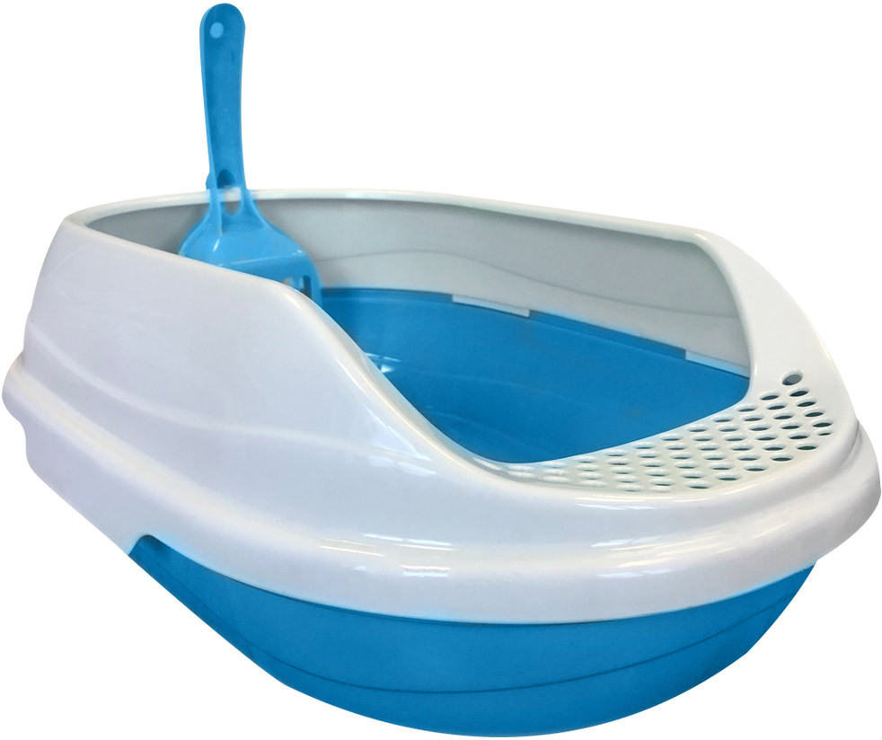 Туалет овальный с высоким бортом для кошек в комплекте с совком. Изготовлен из прочного нетоксичного пластика. Туалет открытый, оснащен высоким бортиком, что предотвращает разбрасывание наполнителя вокруг лотка. В комплект входит совок для уборки туалета.