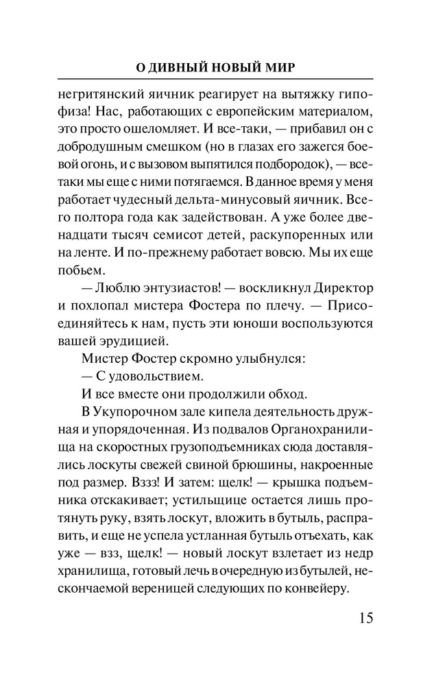 Только что дочитал эту книгу... для меня она неоднозначна. Начало, мягко говоря, ошарашило. Кастовая система общества. К людям относятся как куску мяса. Они - всего лишь часть Общества, часть Системы, ничего не значащие по отдельности. А чего стоят способы приспособить человека к определенной работе, когда он еще в зачаточном состоянии... а гипноподушки... а способ отучить нижние касты от чтения... а детские эротические игры... Первая мысль: "Это же ужасно!" Но после более глубокого чтения начинаешь сомневаться, а так ли все плохо? Видно, что система работает, и все действительно счастливы... ну практически все, исключая некоторых "неблагонадежных" индивидуумов. Люди работают с мыслями: "Как хорошо, что я Бета, на мне не такая большая ответственность, как на Альфах, мне не нужно выполнять такую тяжелую работу, как у Гамм или Дельт". Конечно, все эти мысли им привили еще до их сознательного возраста с помощью гипноподушек, НО они же счастливы. И среди такого общества попадаются так называемые "неблагонадежные" люди, которые не разделяют всеобщего счастья, не хотят быть как все. Речь в романе пойдет как раз об одном "неблагонадежном", его подруге и о человеке, которому он открыл этот "Дивный новый мир". Больше рассказывать не буду, иначе это будет уже не отзыв, а пересказ. Книгу однозначно стоит прочитать. Сюжет интересный, затягивает, читается на одном дыхании и взахлеб. Отзыв о качестве книги. Переплет недорогой, но крепкий. Оформление ярче, чем на фото. Страницы белые, приятные на ощупь. Шрифт довольно крупный, читается легко.
