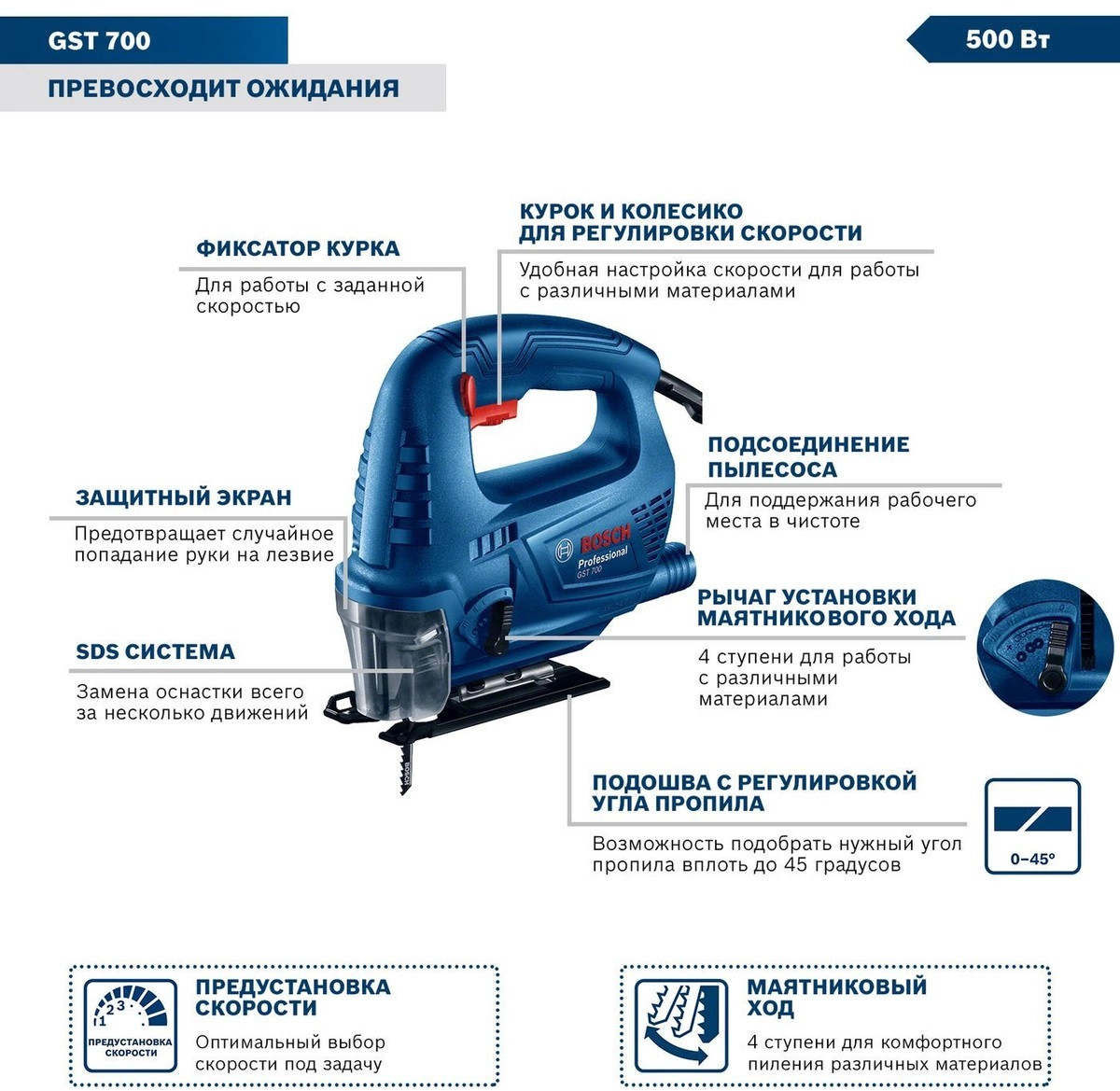 Bosch Лобзик электрический GST 700В данный момент этот товар отсутствует в продаже. Возможно, у нас найдется аналогичный или похожий товар здесь. Лобзик Bosch GST 700 имеет четырехступенчатый маятниковый ход, при помощи которого можно подобрать оптимальную скорость пиления для обрабатываемого материала даже во время работы. Крепление SDS помогает менять пилки быстро и без использования дополнительных приспособлений. Прозрачный экран защищает оператора от стружки и улучшает сбор опилок. К лобзику можно подсоединить пылесос для избавления от основного количества пыли. |