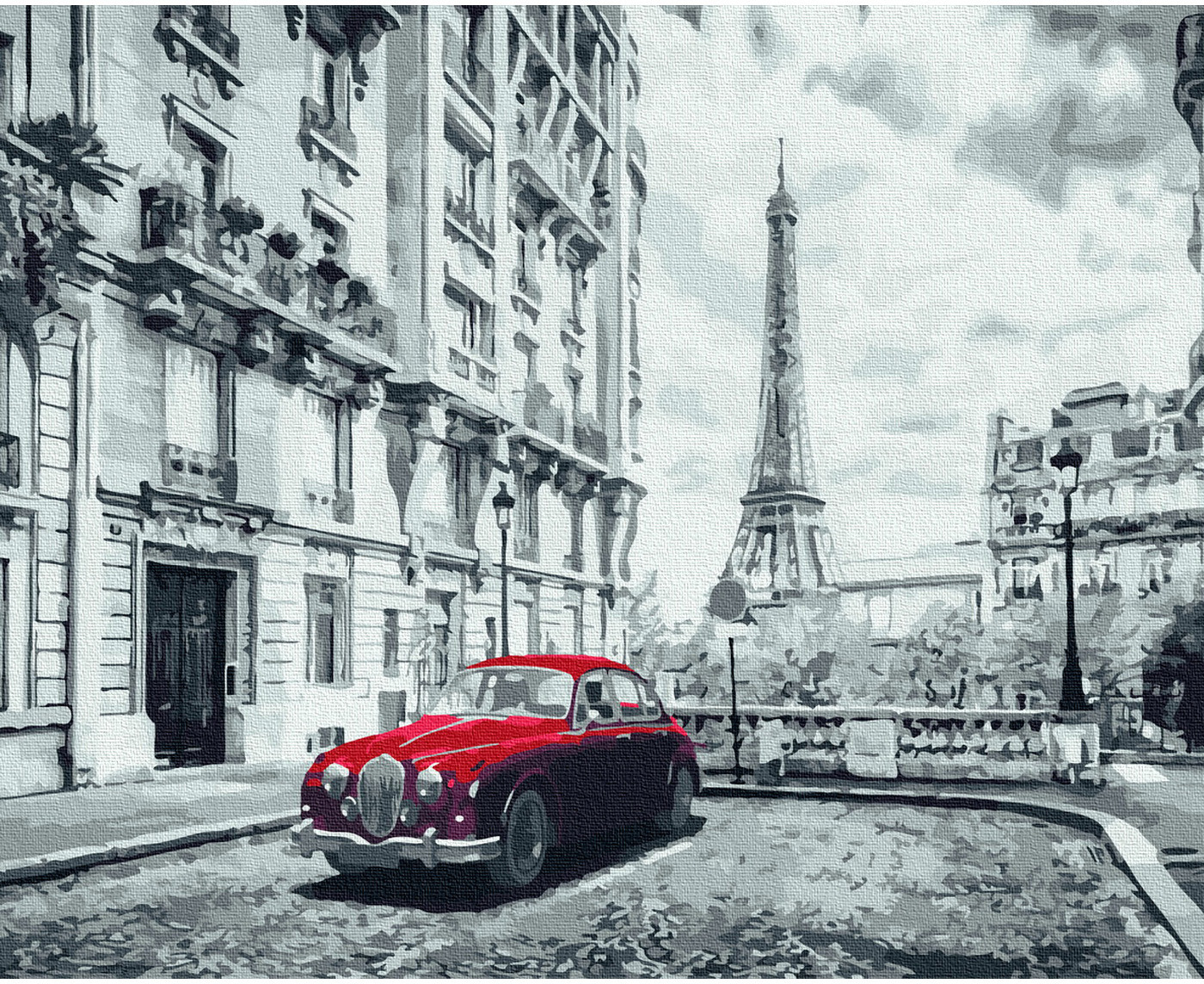 На картине запечатлен парижский пейзаж с ретро автомобилем. Картина выполнена в монохромной технике, когда для основной части изображения используются оттенки одного цвета, в данном случае серого. Акцентом картины является ярко красный автомобиль.