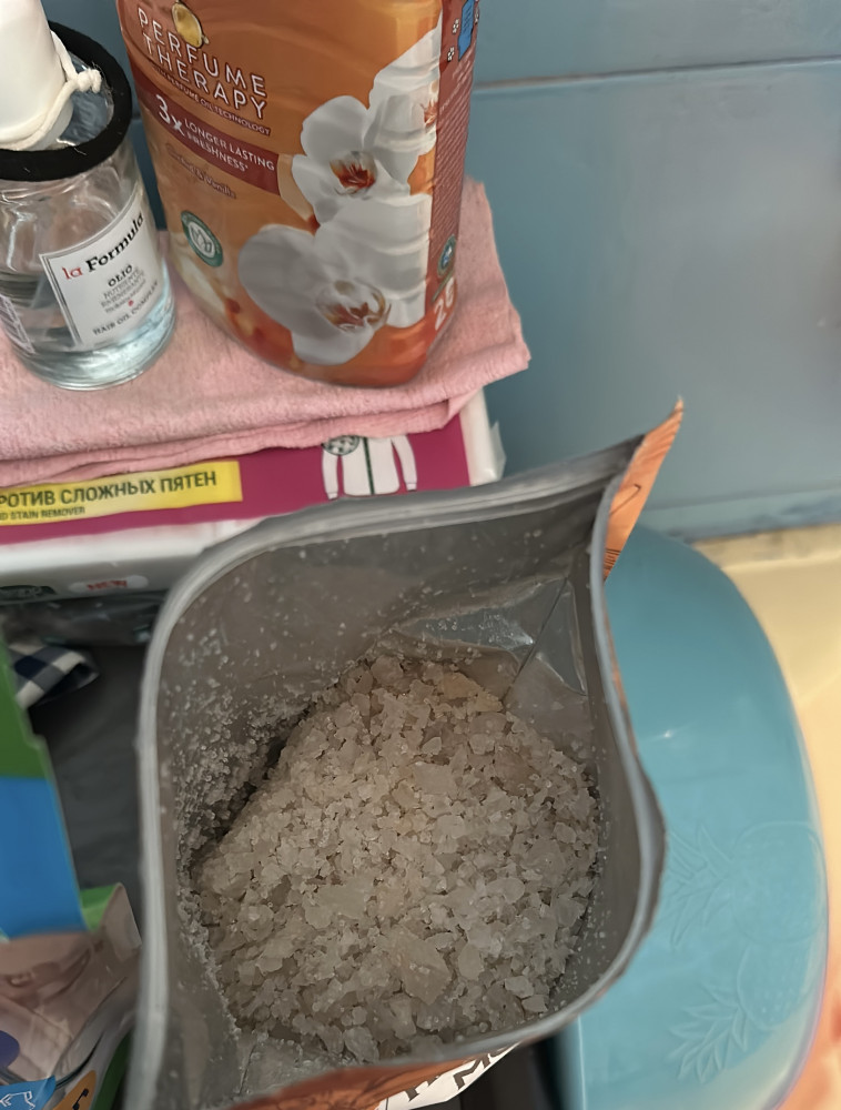Соль комками, слипшаяся, ну это ладно, разные бывают, наверно. Но она не растворилась и чувствовались камни. К тому же запах Розы пах вовсе и не розой. Взяла сразу 2 упаковки.