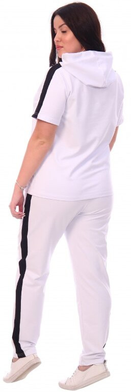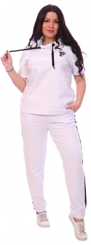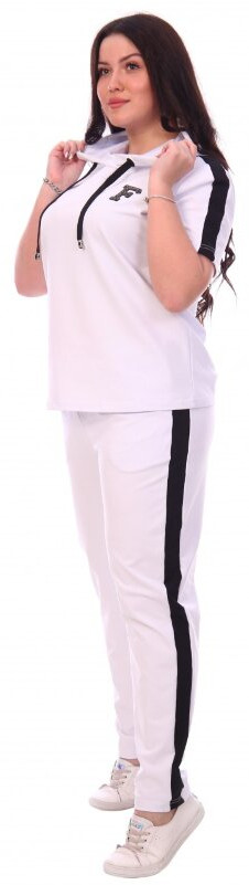 Костюм хорошо сидит на полной фигуре. По отзывам взяла на размер больше, но можно было этого и не делать. Смотрится стильно как на фото. Летним его не назовёшь, скорее осенне весенний ну или для поздних ночных летних прогулок. Ткань достаточно плотная. По ощущениям синтетика чувствуется. Имею подобный костюм - это не убиваемая вещь.