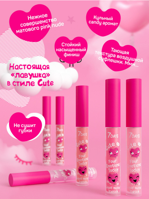 Лови secret #1 — cамая притягательная и волшебная бьюти — это твоя индивидуальность! Чтобы суперски ее подчеркнуть и всегда быть просто «ААА» используй жидкую матовую помаду для губ 7Days Your Emotions Today Cute /107 Nude Pink, ведь ее идеальная, тающая на губах бархатная текстура придаст им фантастическо-бомбическую соблазнительность, а насыщенный нюдовый оттенок сделает губки yummy yummy.