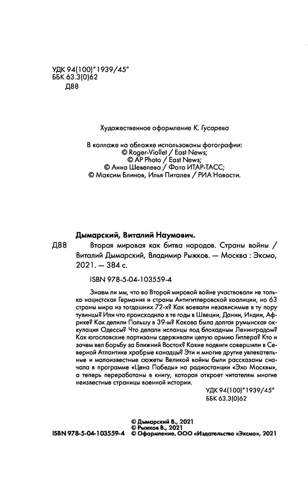 💳 Оплатить за товар можно при получении 🇰🇿 Есть бесплатная доставка по Казахстану 🎁 Копите бонусы с каждой покупки Серия: Дилетант. Проект с научно-популярным историческим журналом («Эхо Москвы») Знаем ли мы, что во Второй мировой войне участвовали не только нацистская Германия и страны Антигитлеровской коалиции, но 63 страны мира из тогдашних 72-х? Как воевали независимые в ту пору тувинцы? Или что происходило в те годы в Швеции, Дании, Индии, Африке? Как делили Польшу в 39-м? Какова была долгая румынская оккупация Одессы? Что делали испанцы под блокадным Ленинградом? Как югославские партизаны сдерживали целую армию Гитлера? Кто и зачем вел борьбу за Ближний Восток? Какие подвиги совершили в Северной Атлантике храбрые канадцы? Эти и многие другие увлекательные и малоизвестные сюжеты Великой войны были рассказаны сначала в программе «Цена Победы» на радиостанции «Эхо Москвы», а теперь переработаны в книгу, которая откроет читателям многие неизвестные страницы военной истории. |