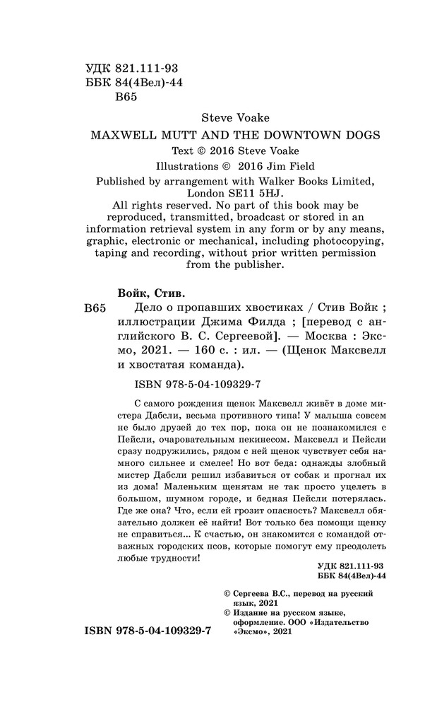 Дело о пропавших хвостикахВ данный момент этот товар отсутствует в продаже. Возможно, у нас найдется аналогичный или похожий товар здесь. Серия: Щенок Максвелл и хвостатая команда С самого рождения щенок Максвелл живёт в доме мистера Дабсли, весьма противного типа! У малыша совсем не было друзей до тех пор, пока он не познакомился с Пейсли, очаровательным пекинесом. Максвелл и Пейсли сразу подружились, рядом с ней щенок чувствует себя намного сильнее и смелее! Но вот беда: однажды злобный мистер Дабсли решил избавиться от собак и прогнал их из дома! Маленьким щенятам не так просто уцелеть в большом, шумном городе, и бедная Пейсли потерялась. Где же она? Что, если ей грозит опасность? Максвелл обязательно должен её найти! Вот только без помощи щенку не справиться... К счастью, он знакомится с командой отважных городских псов, которые помогут ему преодолеть любые трудности! |