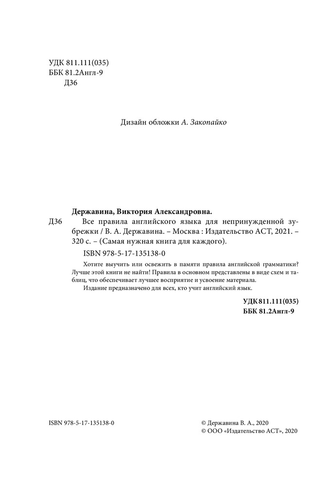 Серия: Самая нужная книга для каждого Хотите выучить или освежить в памяти правила английской грамматики? Лучше этой книги не найти! Правила в основном представлены в виде схем и таблиц, что обеспечивает лучшее восприятие и усвоение материала. |