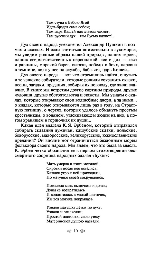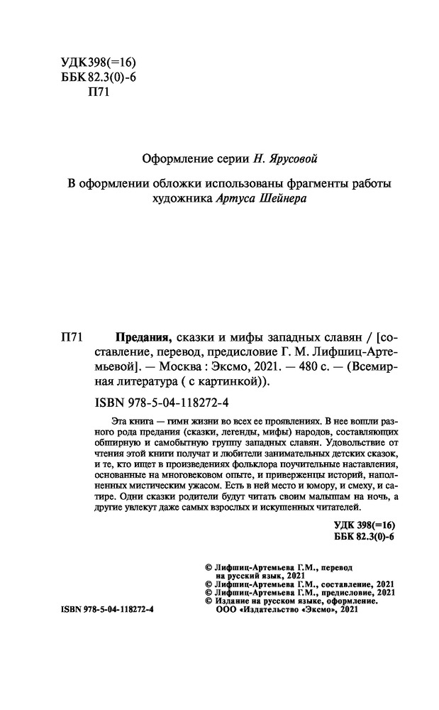 Серия: Всемирная литература (новое оформление) Эта книга — гимн жизни во всех ее проявлениях. В нее вошли разного рода предания (сказки, легенды, мифы) народов, составляющих обширную и самобытную группу западных славян. Удовольствие от чтения этой книги получат и любители занимательных детских сказок, и те, кто ищет в произведениях фольклора поучительные наставления, основанные на многовековом опыте, и приверженцы историй, наполненных мистическим ужасом. Есть в ней место и юмору, и смеху, и сатире. Одни сказки родители будут читать своим малышам на ночь, а другие увлекут даже самых взрослых и искушенных читателей. |