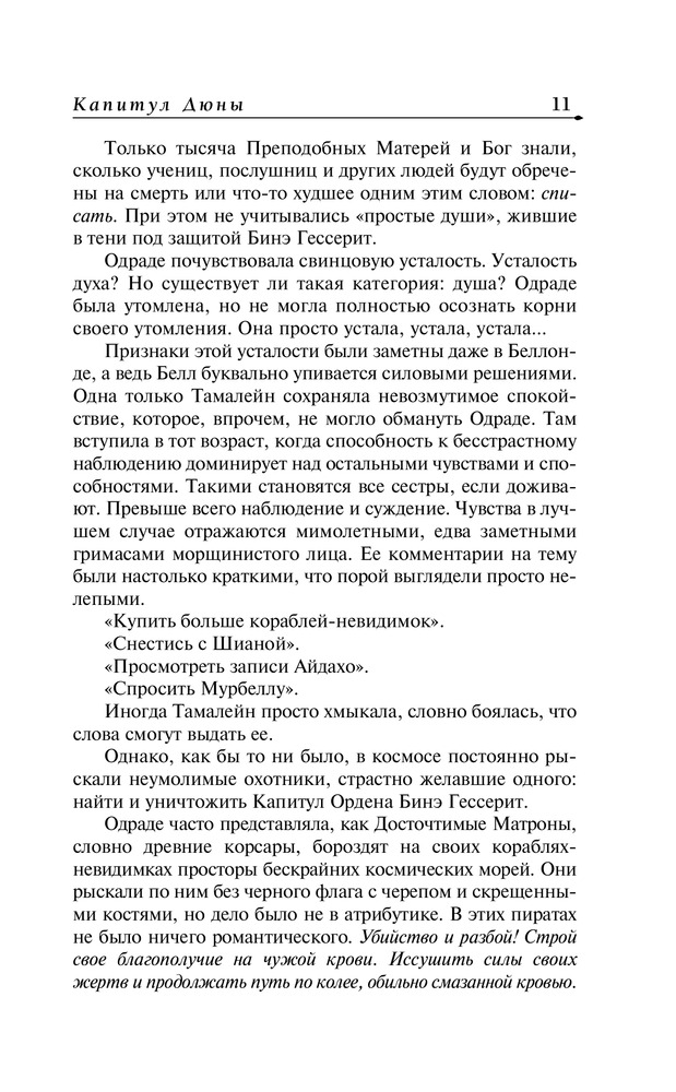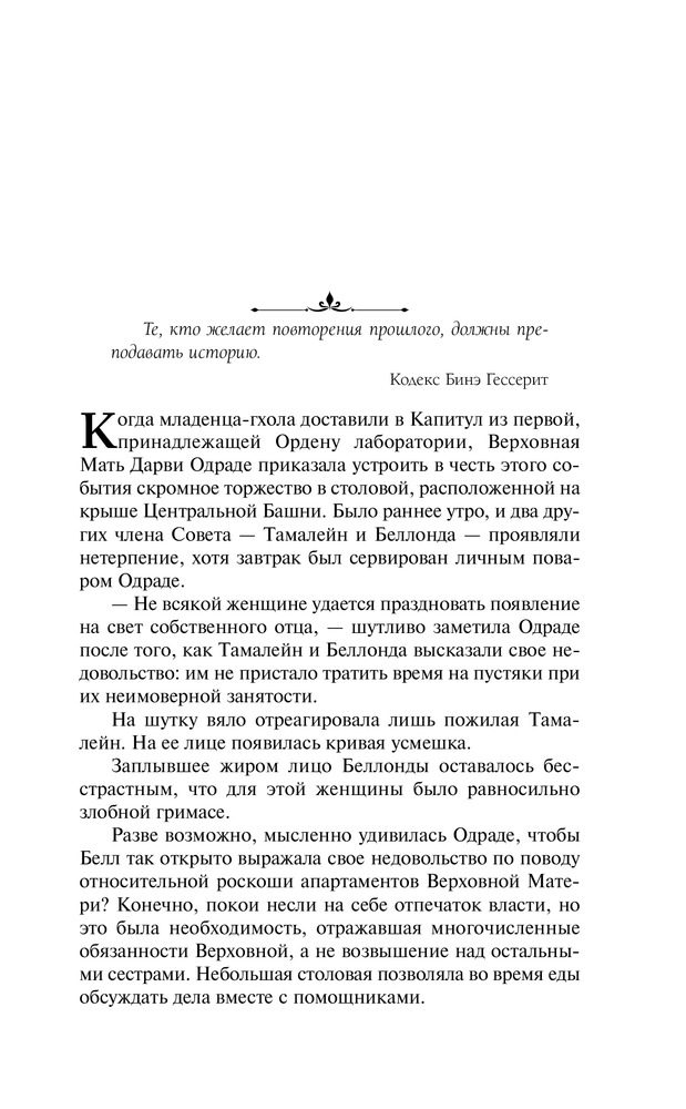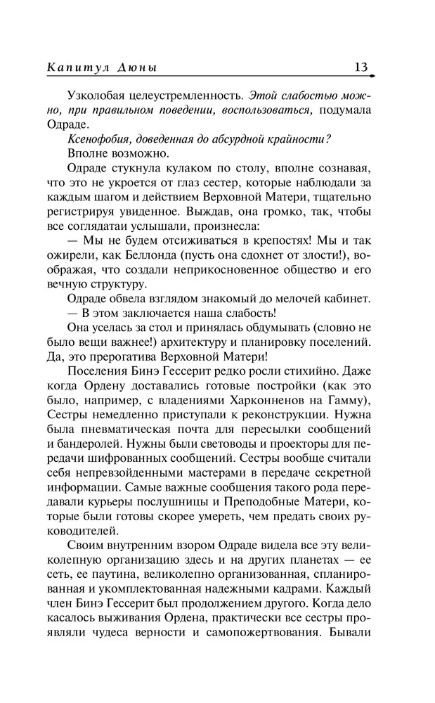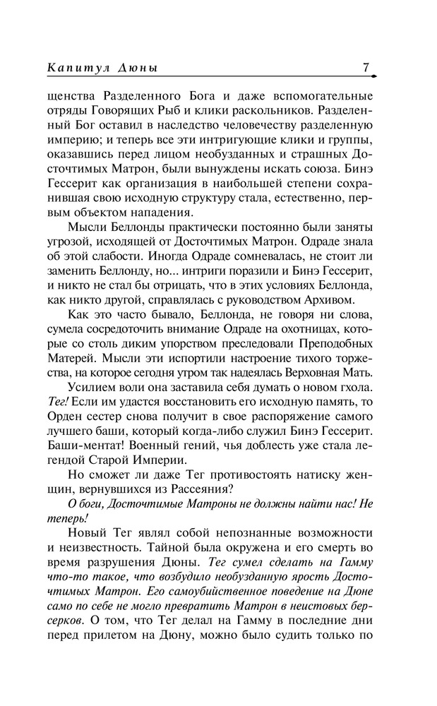 Сюжет любопытный, пожалуй первая (и единственная у автора в серии) книга, где фокус сюжета не только на планете Дюна/Арракис. Однако финальная часть книги оставила некоторое недоумение, множество сюжетных линий не совсем довели до ума, очень сильно сюжет разгоняли и подогревали всю книгу, но финал вышел скомканным и смазанным. Возможно, связано это с тем, что Фрэнк Герберт планировал написать еще книгу и эта часть не была изначально финальной, но умер раньше чем написал следующую книгу, но финал правда смазанный для такой грандиозной эпопеи в 6 актах