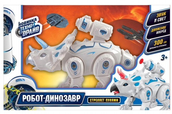 Технодрайв Робот-динозаврВ данный момент этот товар отсутствует в продаже. Возможно, у нас найдется аналогичный или похожий товар здесь. Робот-динозавр станет отличным подарком для ребёнка. У динозавра есть звуковое сопровождение и световые эффекты, а также он может двигаться вперёд. Динозавр умеет стрелять пулями. Дальность стрельбы 3 м. Современный и стильный робот в виде динозавра приведёт малыша в восторг. С ним можно придумать много разных интересных сюжетов для игр. Компактный размер игрушки позволяет брать её с собой на прогулку, в гости к друзьям или в поездку.  |