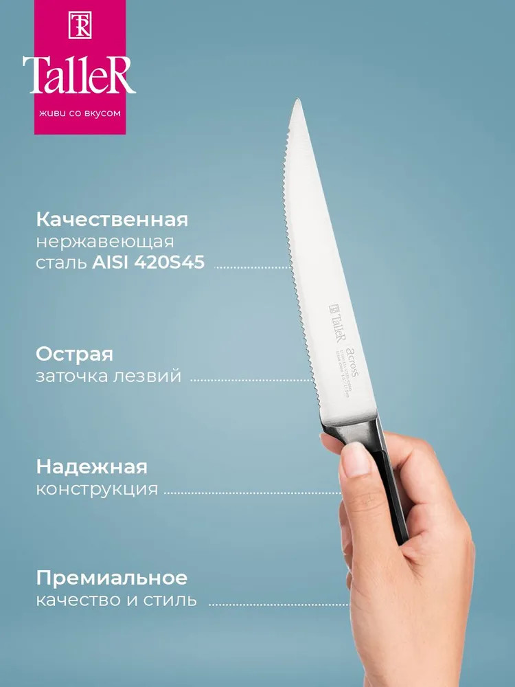 TalleR Нож для стейка «Акросс»В данный момент этот товар отсутствует в продаже. Возможно, у нас найдется аналогичный или похожий товар здесь. Серия: Акросс Нож подходит для разрезания стейка и других мясных блюд.. Сквозной хвостовик увеличивает прочность лезвия. |